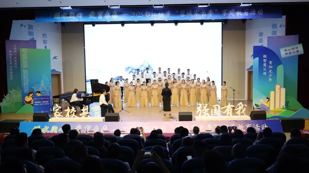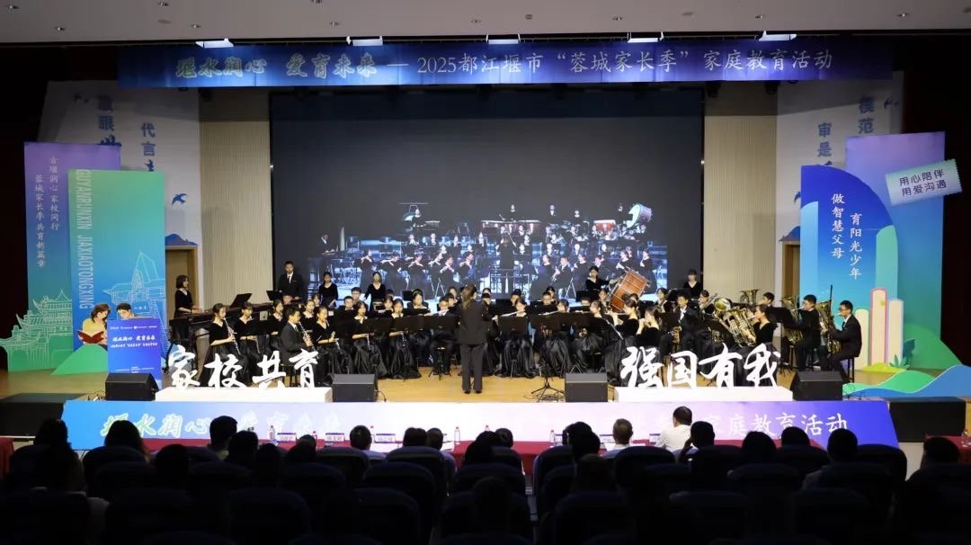 活动中,都江堰市实验中学管乐班带来了管乐和合唱表演,学生们以原创交响乐演绎出“家校共育”的澎湃乐章。