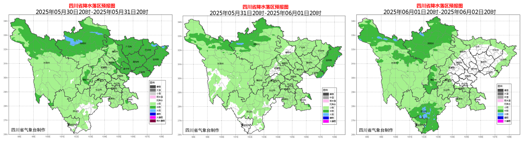 预计:5月30日晚至31日晚,全省有一次降水天气过程,盆地北部、川西高原北部有中雨,局地大雨;