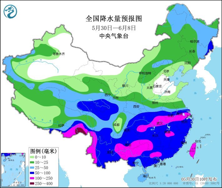 目前,我国南方地区正处于一个多雨时段。据中央气象台预报,5月30日至6月2日,青藏高原东部及中东部地区将有一次较大范围降水过程,江汉中南部、江淮西部、江南、华南北部及西藏东南部、贵州、云南西部和东部等地先后有中到大雨,其中湖北东部、湖南北部、安徽南部、江西北部、浙江中西部及西藏东南部、云南西北部等地部分地区有暴雨、局地大暴雨,并伴有局地短时强降水、雷暴大风等强对流天气。