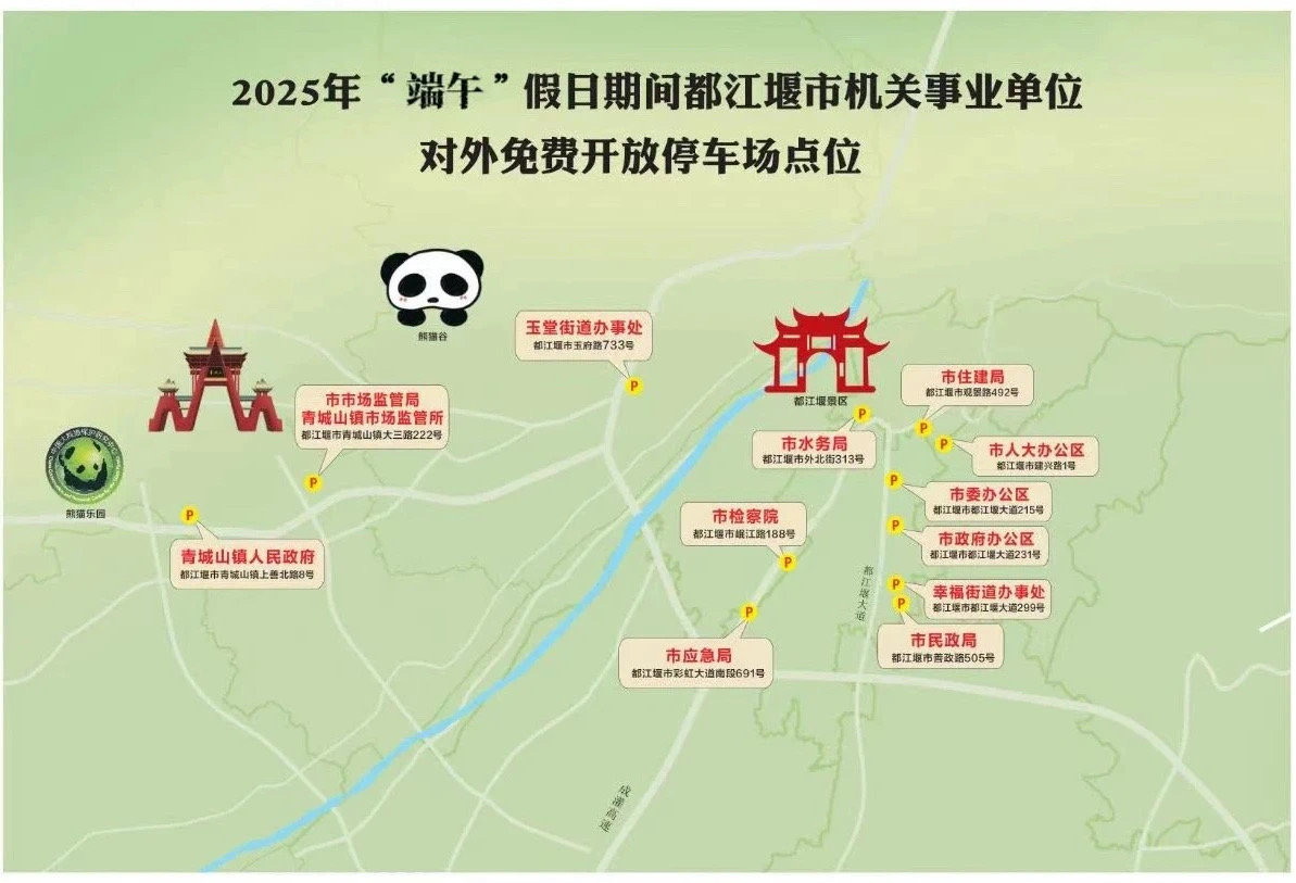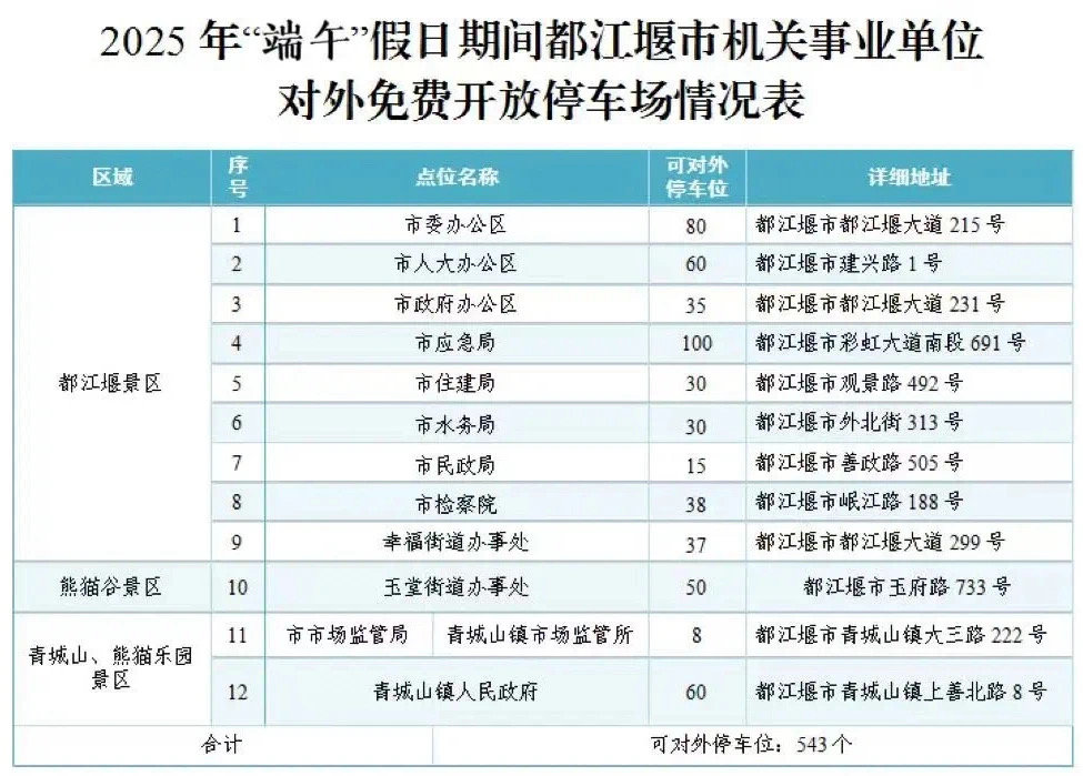 这个端午假期,“三遗之城”都江堰市推出丰富多彩的文旅活动,青城山-都江堰景区、成都融创乐园、熊猫谷等热门景区即将迎来旅游高峰。5月30日,川观新闻记者获悉,为缓解端午假期“停车难”问题,都江堰市机关事业单位将在假期免费提供543个停车位,方便游客停车。