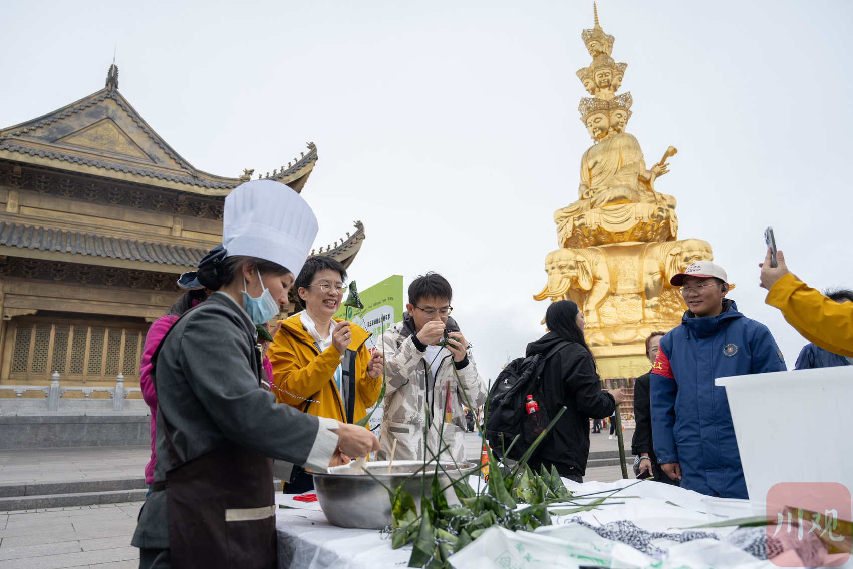 端午前夕的峨眉山万佛顶,粽叶清香与竹篾翻飞交织成节庆序曲。现场举办的游客包粽子活动,吸引了嘉宾们的积极参与。来自新加坡某旅行社的Sharon告诉记者:“这是非常独特的体验!”粽叶飘香的同时,一场峨眉武术快闪登场:舞棍虎虎生风,双刀银光闪闪,武术的刚劲与自然的秀美在千年名山之巅淋漓展现,牢牢攫取了嘉宾们的目光。