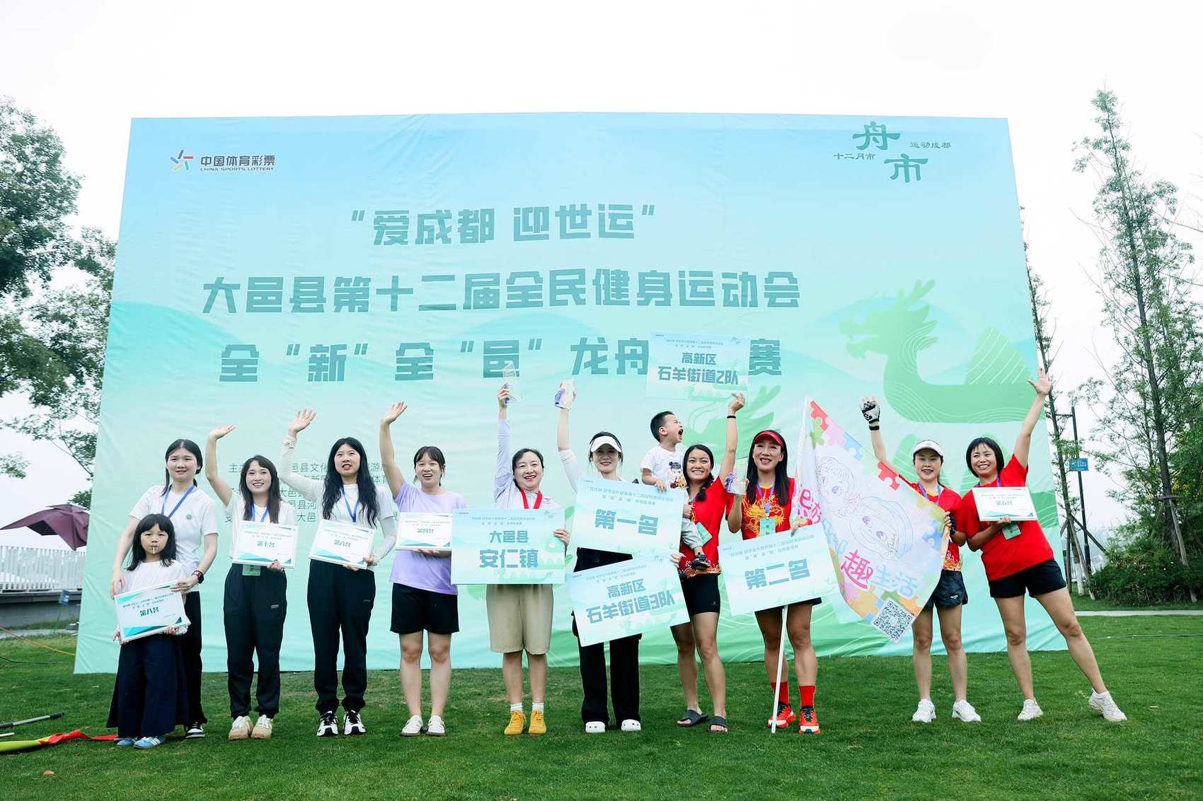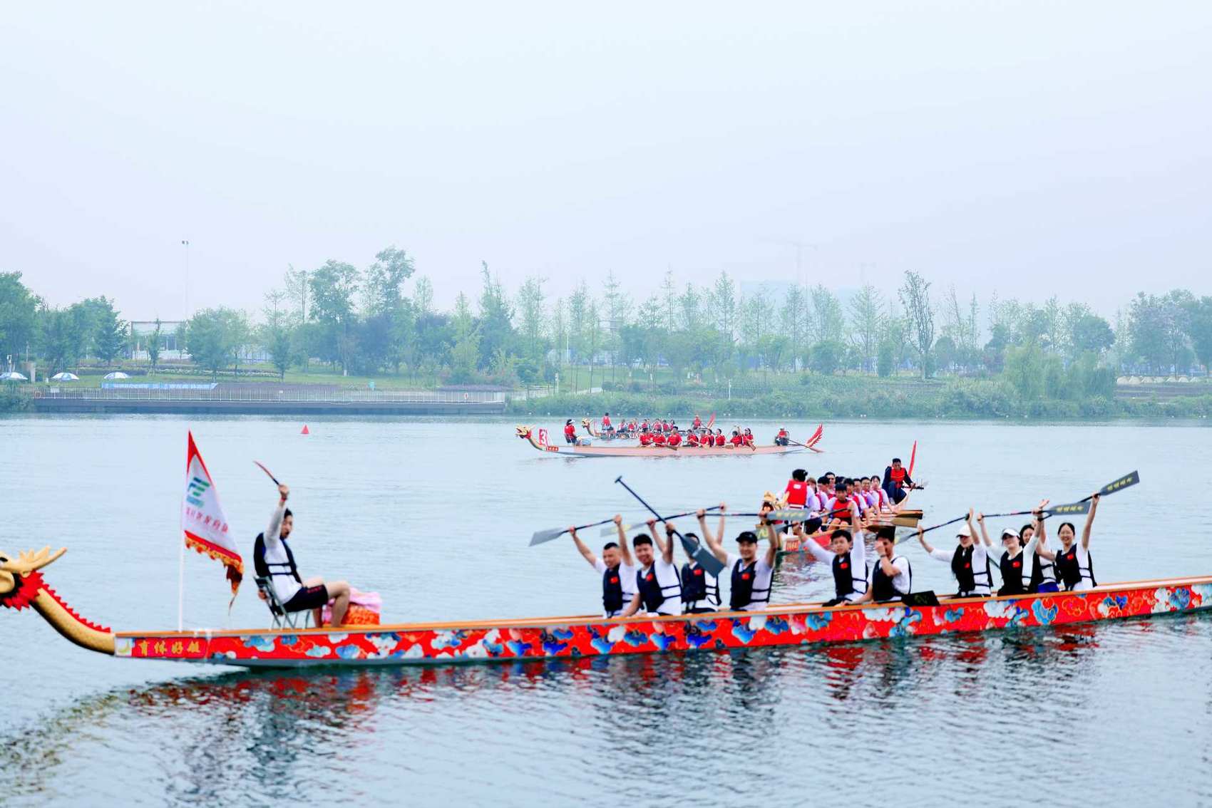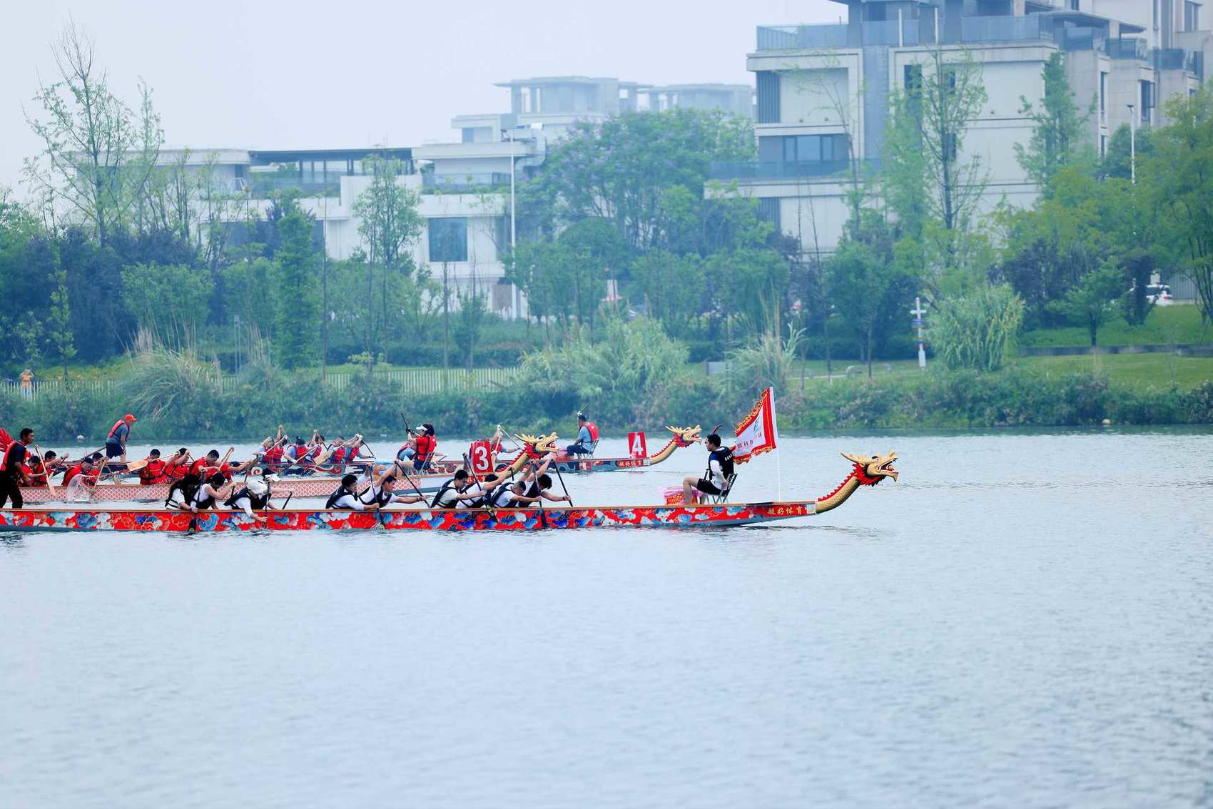 这场比赛是大邑县第十二届全民健身运动会的一项内容,参赛的19支队伍,来自大邑县和市域结对合作区——成都高新区。从清晨9时开赛,在200米长的赛道上,经过3个小时预赛、半决赛、决赛的激烈角逐,分别决出了前八名,成都高新区石羊街道三队夺冠。现场观众在濛濛细雨中观战,领略端午赛龙舟传统的魅力。