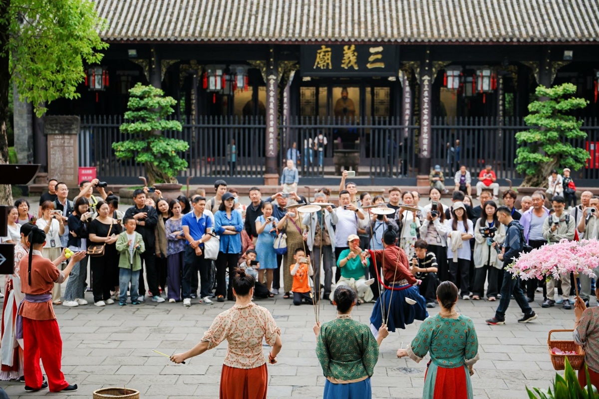 在武侯祠博物馆三义庙前,古风巡游吸引了不少游客观赏。