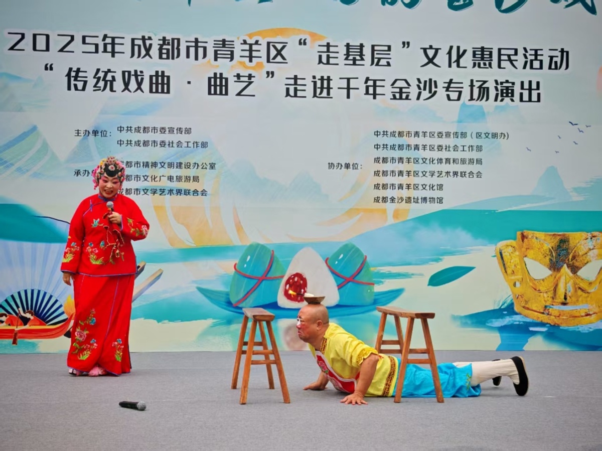 在成都金沙遗址博物馆,馆方邀请专业演出人员,为观众送上金钱板、方言诗小品、相声、川剧变脸等传统曲艺节目。川味浓浓的曲艺节目,让不少游客直呼过瘾。