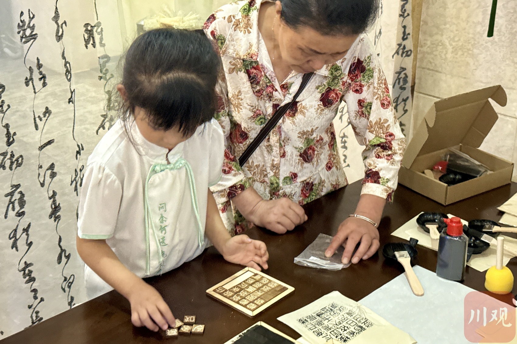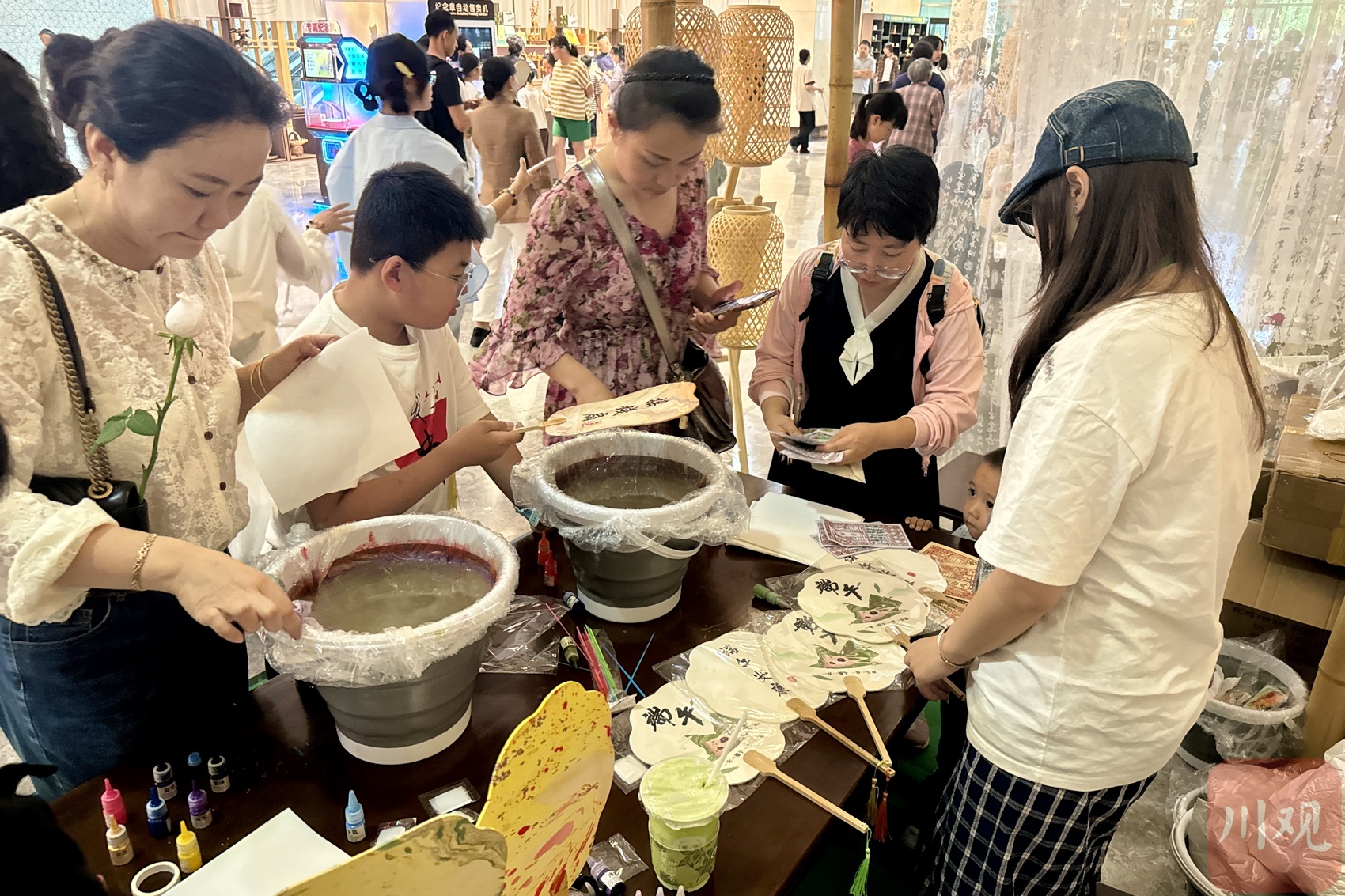 瓷纹香囊DIY、百索祈福、漆扇彩绘……端午手作区同样精彩,人气爆棚。游客排队凭游戏赢得的“银票”即可化身“手艺人”,参与各式传统手工艺品制作。“10两银票可以体验制作一把非遗漆扇,我要再去挣点钱,还要做一个香囊。”小朋友吴依娜玩得很开心。