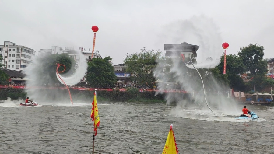 5月31日上午,乐山市市中区苏稽镇茹公桥——廊桥水域人声鼎沸。“水上飞人”酷炫出场,开启水上表演秀,并在空中展示“嘉‘舟’竞渡 欢乐端午”横幅。2025年乐山市市中区第二届欢乐龙舟赛暨川渝地区龙舟邀请赛开幕。