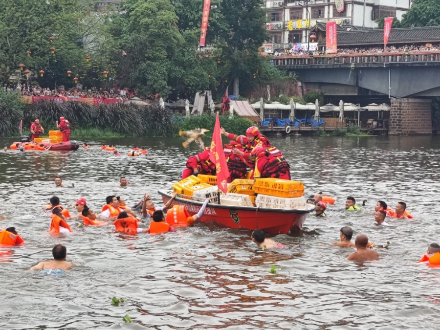 比赛结束后,传统民俗“抢鸭子”活动热闹登场,将现场气氛再次推向高潮。峨眉河上,工作人员分批次投放鸭子,选手们跃入水中追逐,鸭子四散奔逃,岸上观众笑声、喝彩声不断,为节日增添更多欢乐与惊喜。 (部分视频素材由乐山市市中区融媒体提供)