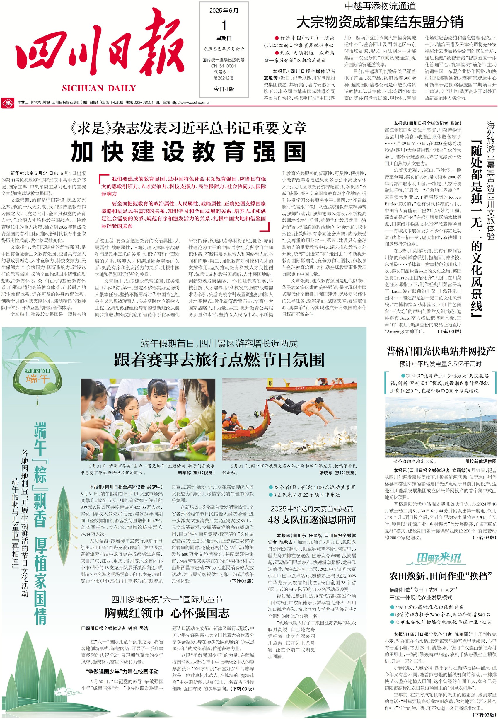 端午假期首日,四川文旅市场喜迎"双节":全省A级景区接待游客433.35万人次,同比增长19.42%;非遗节主会场免费开放吸引游客2.6万人次。全国48支龙舟队会聚新津展开竞逐,7万名观众现场助阵。儿童节与端午碰撞出别样火花——成都校园包粽子,凉山校园上演旱地龙舟。全省288个社区开展"非遗+端午"特色活动,配合文旅消费券发放,营造浓厚节日氛围。详见今日一版。