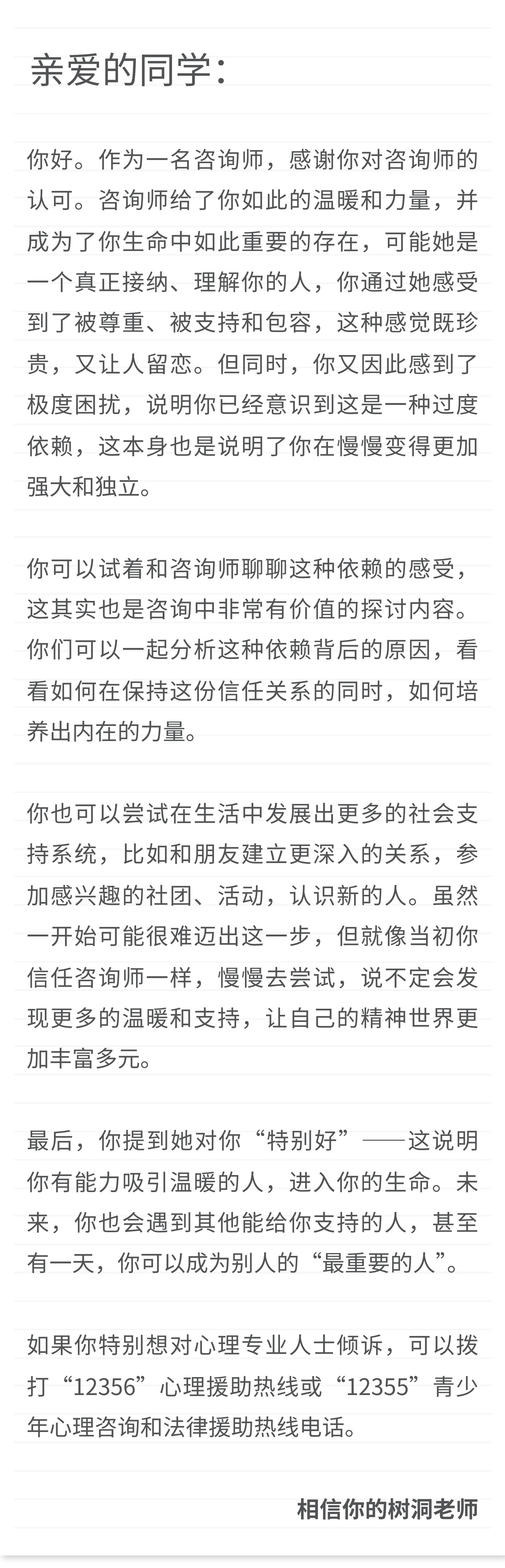 一名17岁高中女生:2024年和我的咨询师相遇,一年多以来特别依赖咨询师。感觉咨询师是我唯一的精神支柱,是我生命中的最重要的人,我离不开我的咨询师,她对我特别好。