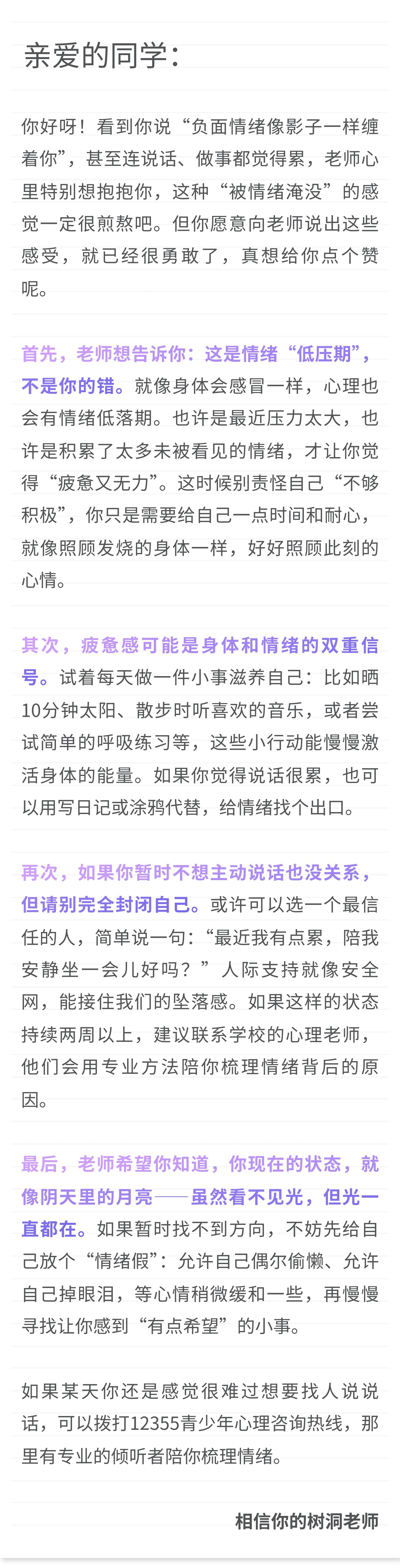 一名20岁大学女生:这段时间我的负面情绪始终大于正面情绪。而且负面情绪长期伴随,不太愿意主动说话,感觉做什么事都很疲惫,不知道为什么。