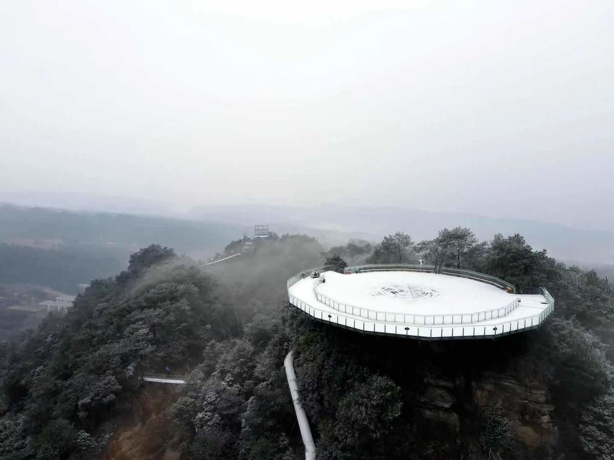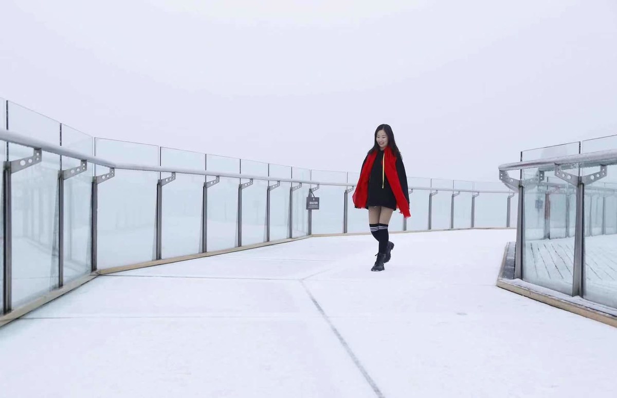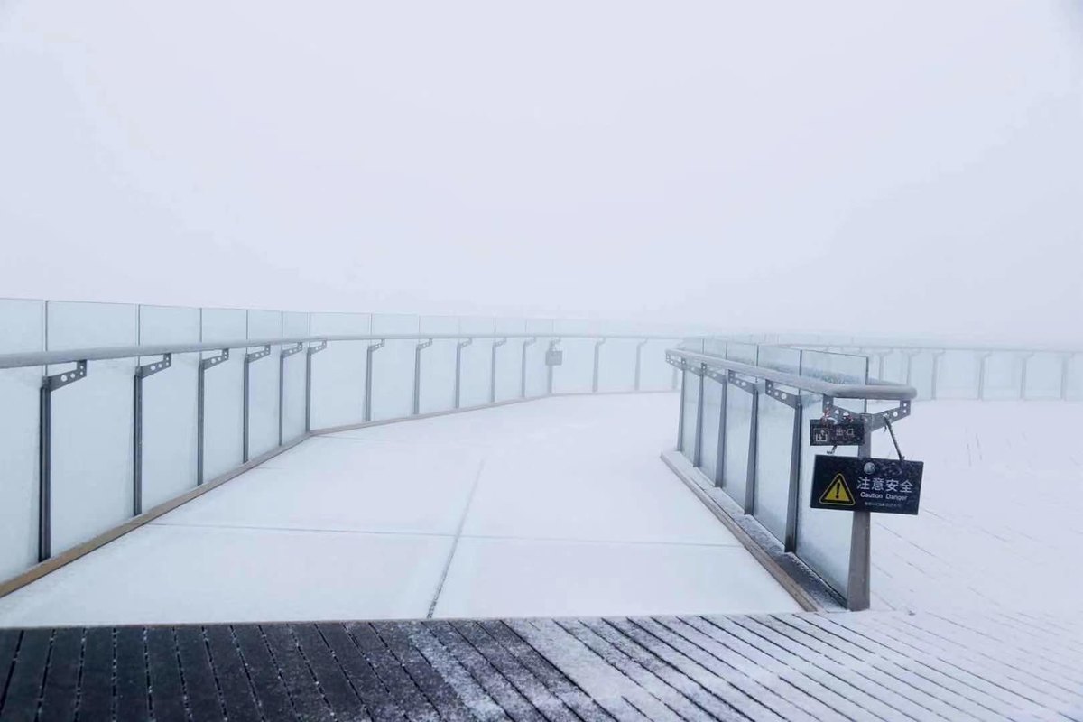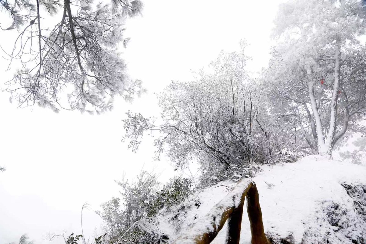 在五华山,白雪铺在玻璃栈道、花海、森林上,也浅浅地点缀了下景区里的小木屋,仿佛给五华山批了一层白纱,引起不少市民前往看雪及拍照。
