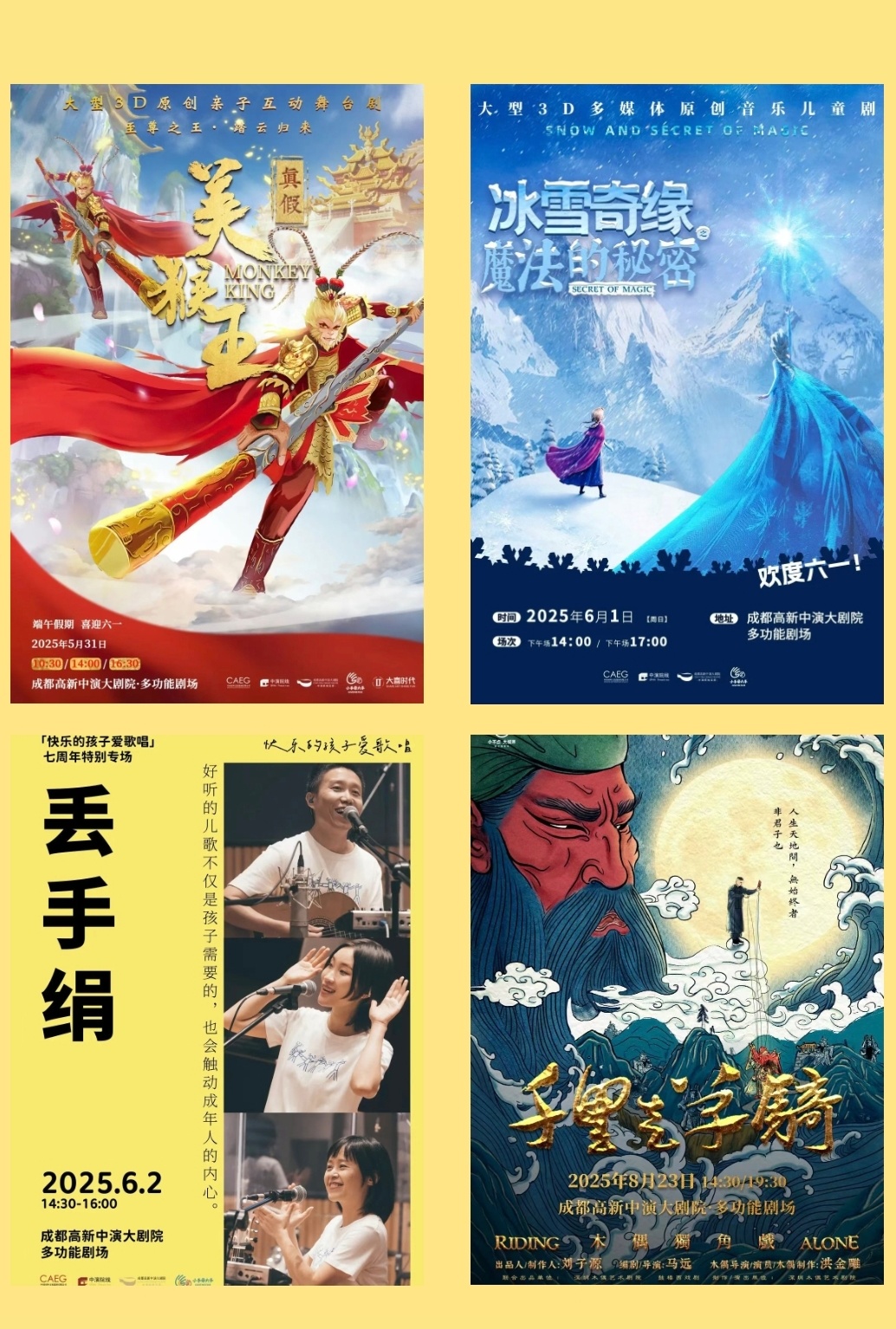 成都高新中演大剧院2025第二届“小手牵大手”亲子合家欢演出季部分剧目海报。