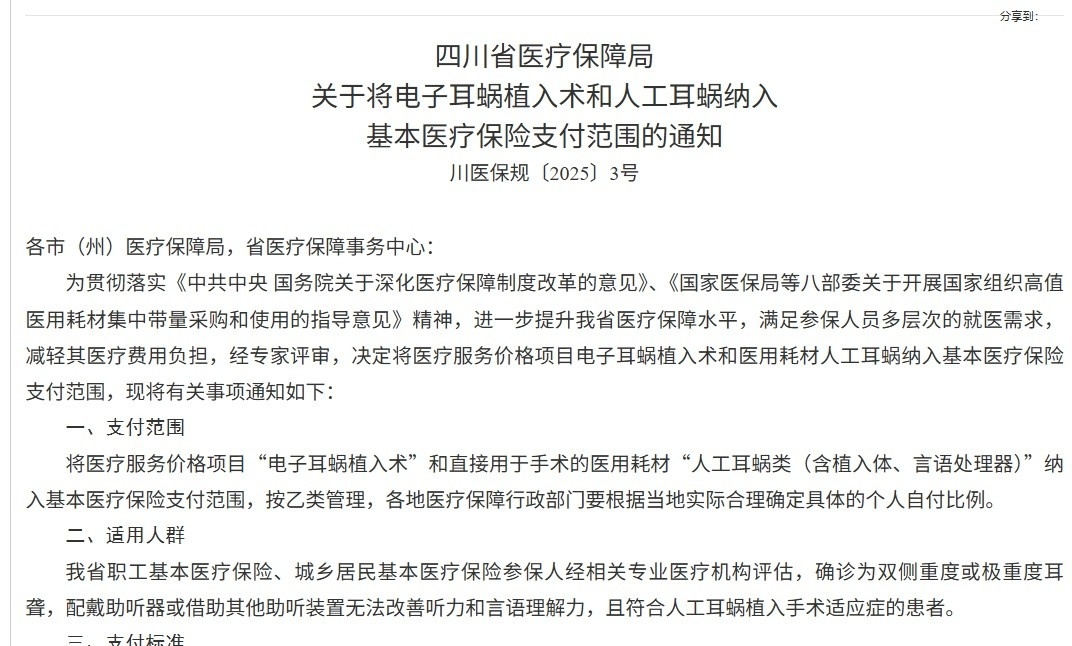 6月1日起, 四川省医疗保障局正式将电子耳蜗植入术及人工耳蜗纳入基本医疗保险支付范围。全省职工基本医疗保险、城乡居民基本医疗保险参保人,经确诊为双侧重度或极重度耳聋,且在佩戴助听器等常规助听方式无效,同时符合人工耳蜗植入手术适应症的患者,都能享受这一政策红利。
