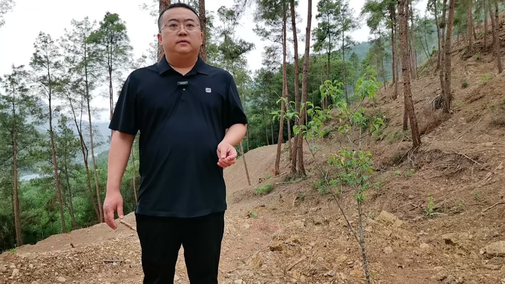 牛飞村国家储备林基地内,李乾坤介绍新栽果梅苗的情况。