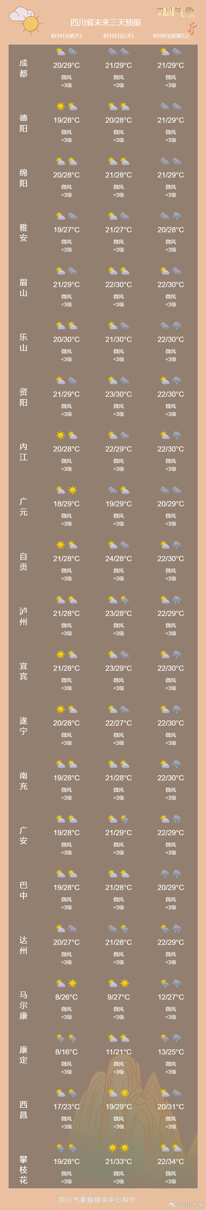 四川省气象台预计,6月3日至5日,全省以多云天气为主,盆地大部为多云到晴的天气,川西高原和攀西地区多阵雨(雪)或雷雨。