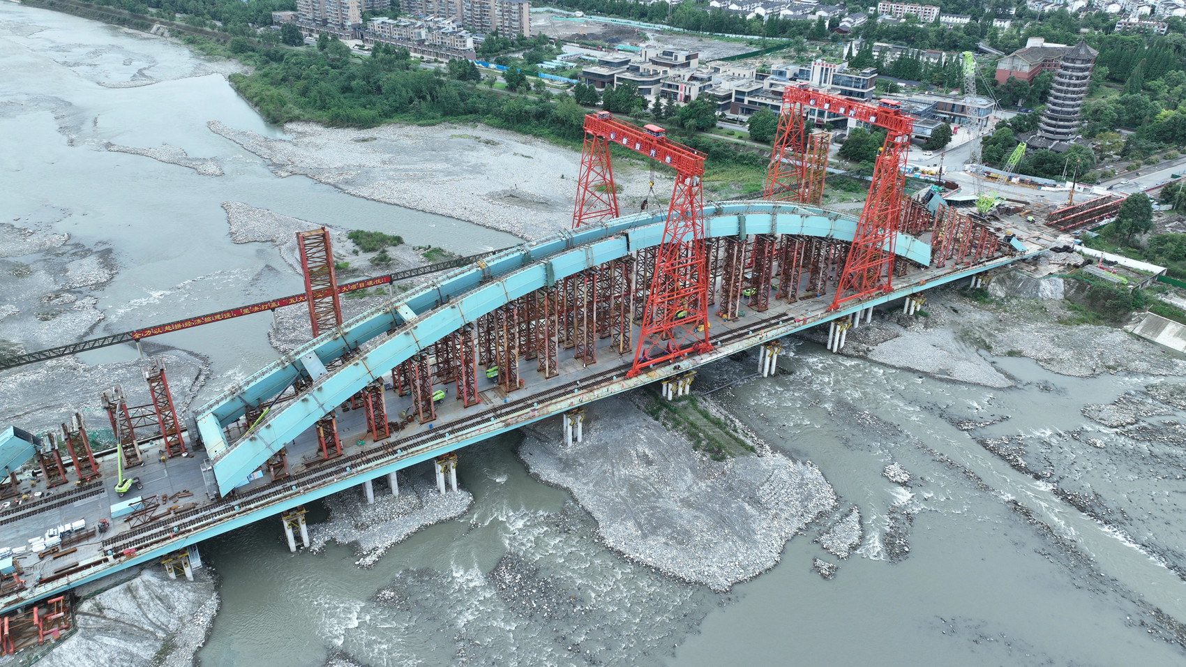 作为横跨岷江的重要通道,青城大桥主桥采用钢拱钢梁下承式系杆拱桥,总用钢量达1.35万吨。此次提升段钢拱合龙,为7月全桥钢拱整体提升合龙奠定坚实基础。