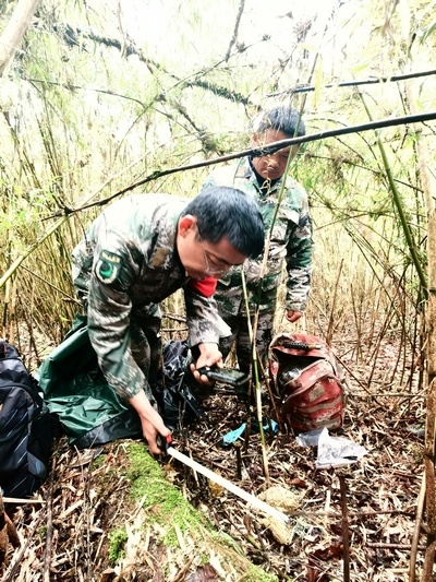 做完这一切,陈明华和桔拿曲铁才开始往保护站走,一路又要经历一次“披荆斩棘”。陈明华说,他和队友们自4月2日开始进山巡护监测,每天都是这样在山上度过的。