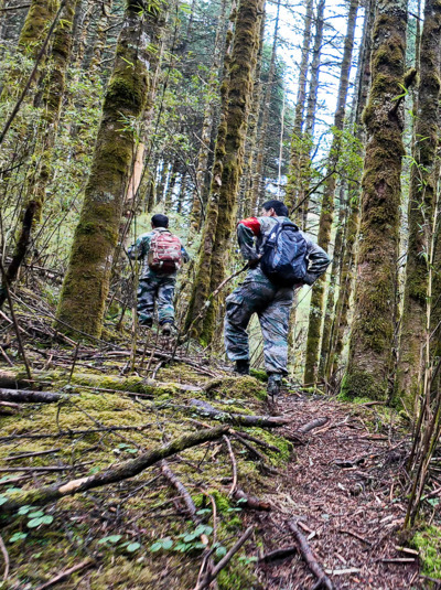 随着海拔不断升高,行进的速度越来越慢,陈明华和桔拿曲铁时不时被树杈、荆棘、歪倒的竹竿挡住去路,两人只能不断爬、攀、拉、蹬,手脚并用,艰难向前。不一会儿,两人大汗淋漓、气喘吁吁,已分不清雨衣里流的是雨水还是汗水了。