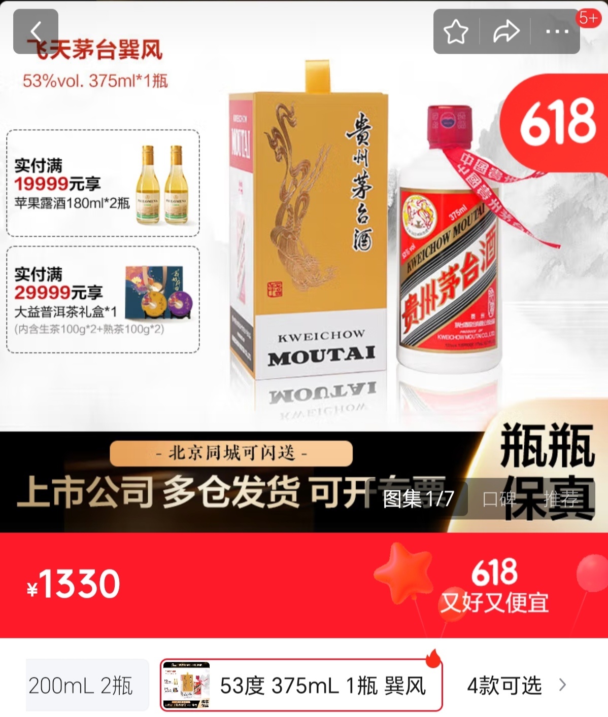 不过,记者随机进入“53度飞天茅台1499元”的店铺,客服却表示这是“200毫升×2”的价格。“如果按照这个价格来计算,500毫升茅台的到手价相当于1875元。”姜长江还表示,各网购平台上还出现了大批承诺鉴真的“外贸版53度茅台”“巽风茅台(375毫升)等产品,相比以往价格都有相当大的优惠。