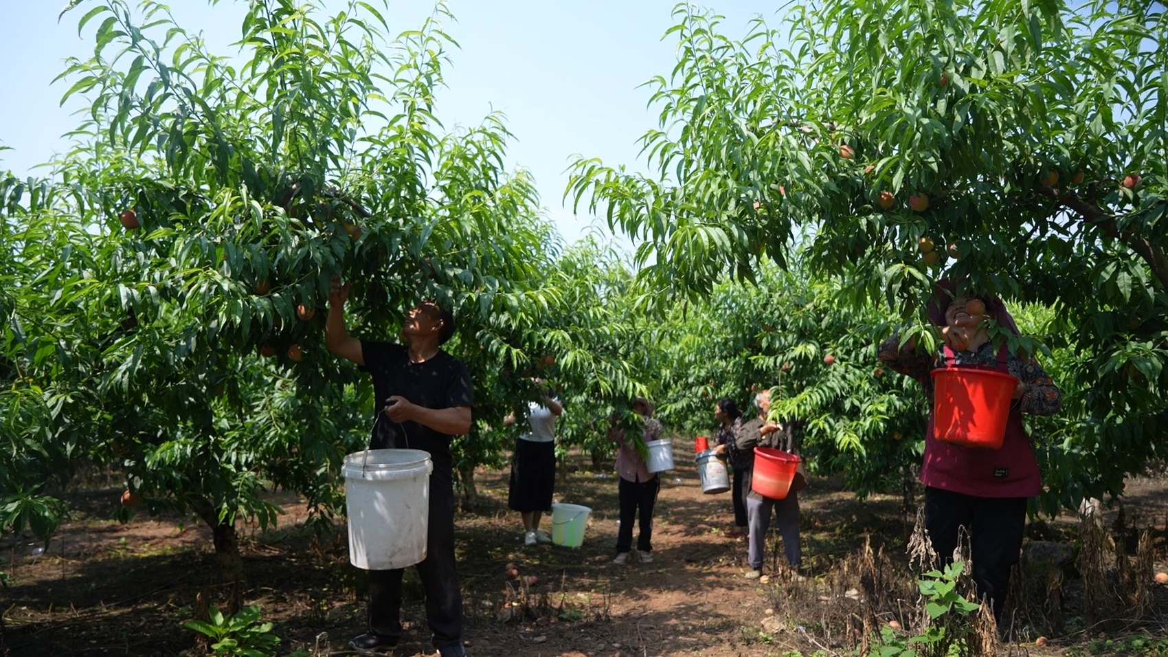 村民采摘桃子。