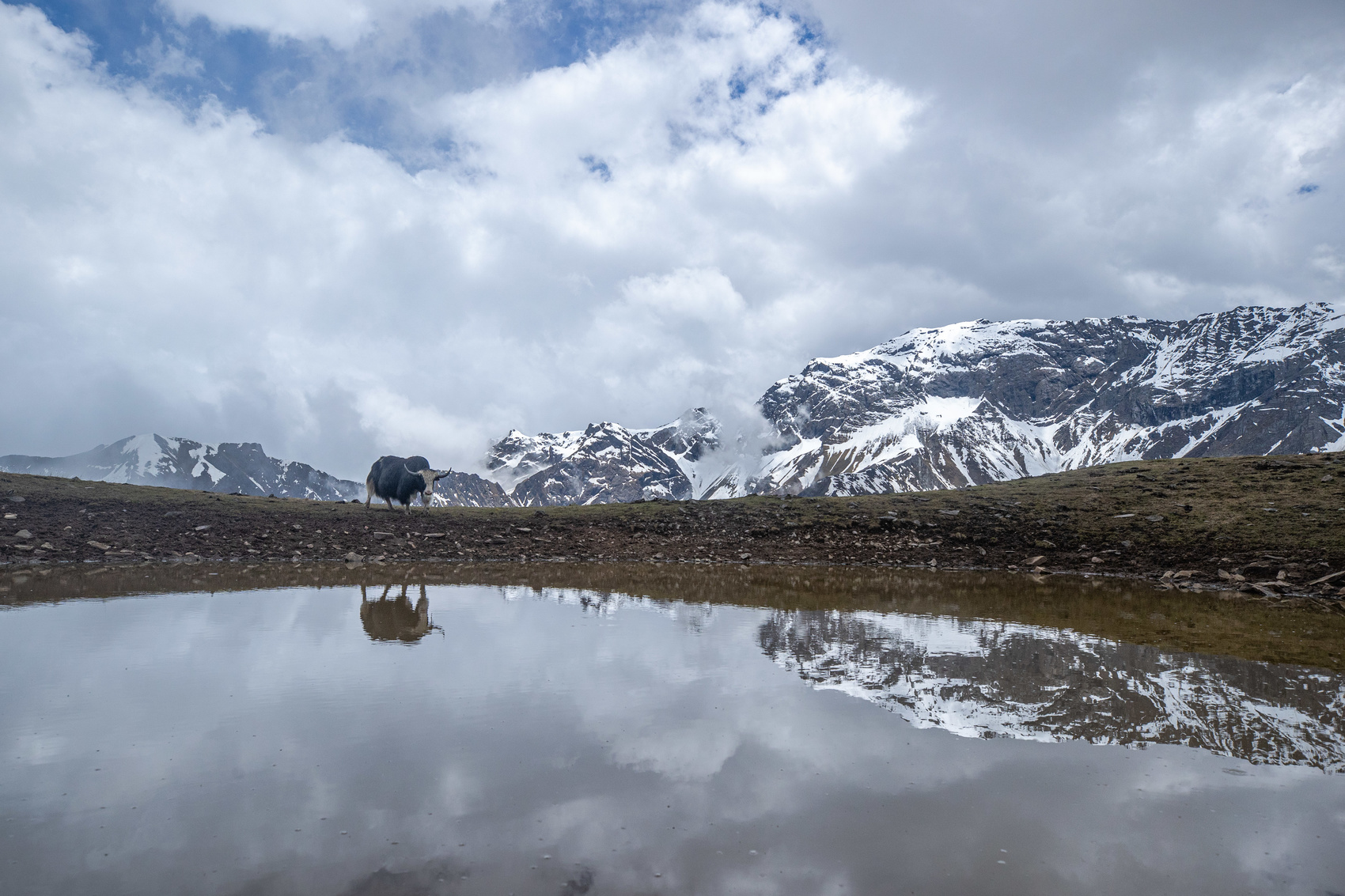 雪山、海子、牦牛构成一幅大自然的美丽画卷