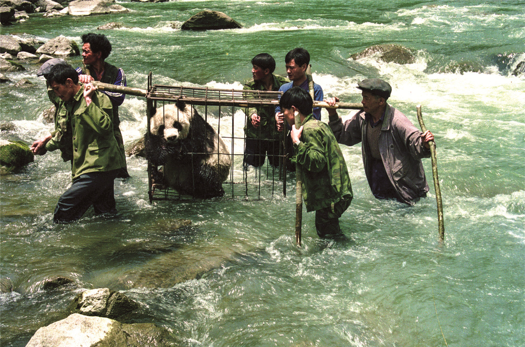 1993年4月6日,景兴智等人蹚河运送受伤大熊猫(高华康 摄)