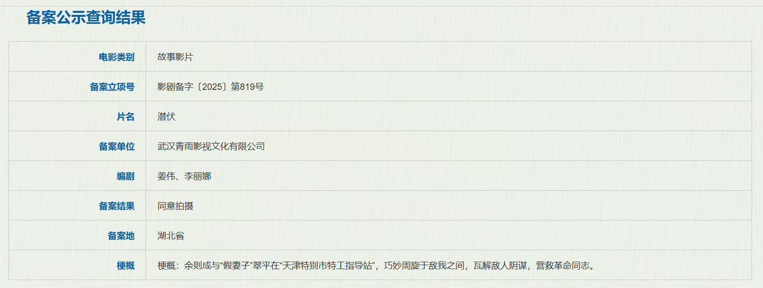 余则成同志,组织需要你再"潜伏"一次!哈哈,经典谍战剧《潜伏》要拍电影版啦!编剧还是那个让反派集体失眠的姜伟,备案单位依然是"老东家"青雨影视!期待中😁😁😁