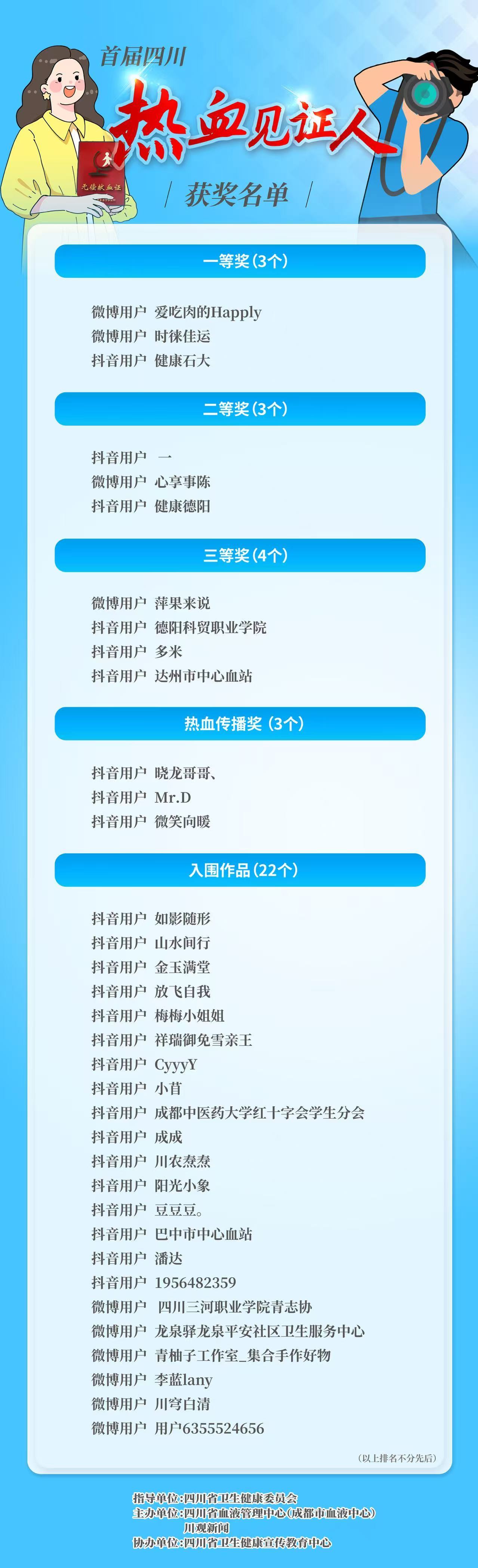 6月6日,首届 “四川热血见证人” 征集结果揭晓!这场以 “热血” 为名的生命之约从4月21日持续至今,吸引全川乃至省外热心群众的踊跃参与,各平台投稿作品获近百万关注。该活动由四川省卫生健康委员会指导,四川省血液管理中心(成都市血液中心)和川观新闻主办,四川省卫生健康宣传教育中心协办发起。