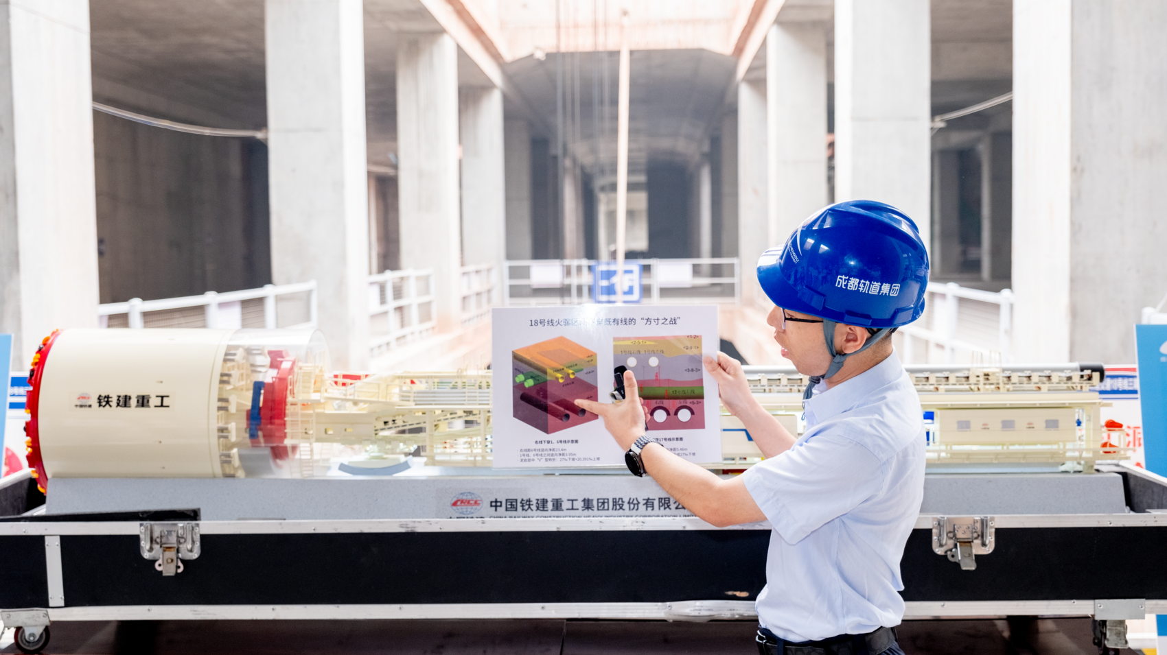 现场,成都轨道建设公司工作人员周博解释,盾构就是用机器在地面下暗挖隧道,同时采用钢筋混凝土管片等材料对洞身进行支护,形成坚固的永久洞壁。周博现场展示了18号线三期使用的盾构机模型,“长度可达120余米,是真正的‘钢铁巨无霸’。”