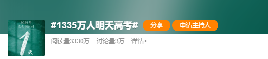 明天就要高考了。今天,话题“1335万人明天高考”冲上热搜。不少网友在评论区表达了对高考学子的祝福。