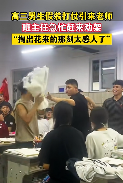 有同学假装打架,引来老师,为老师送上突然的惊喜。