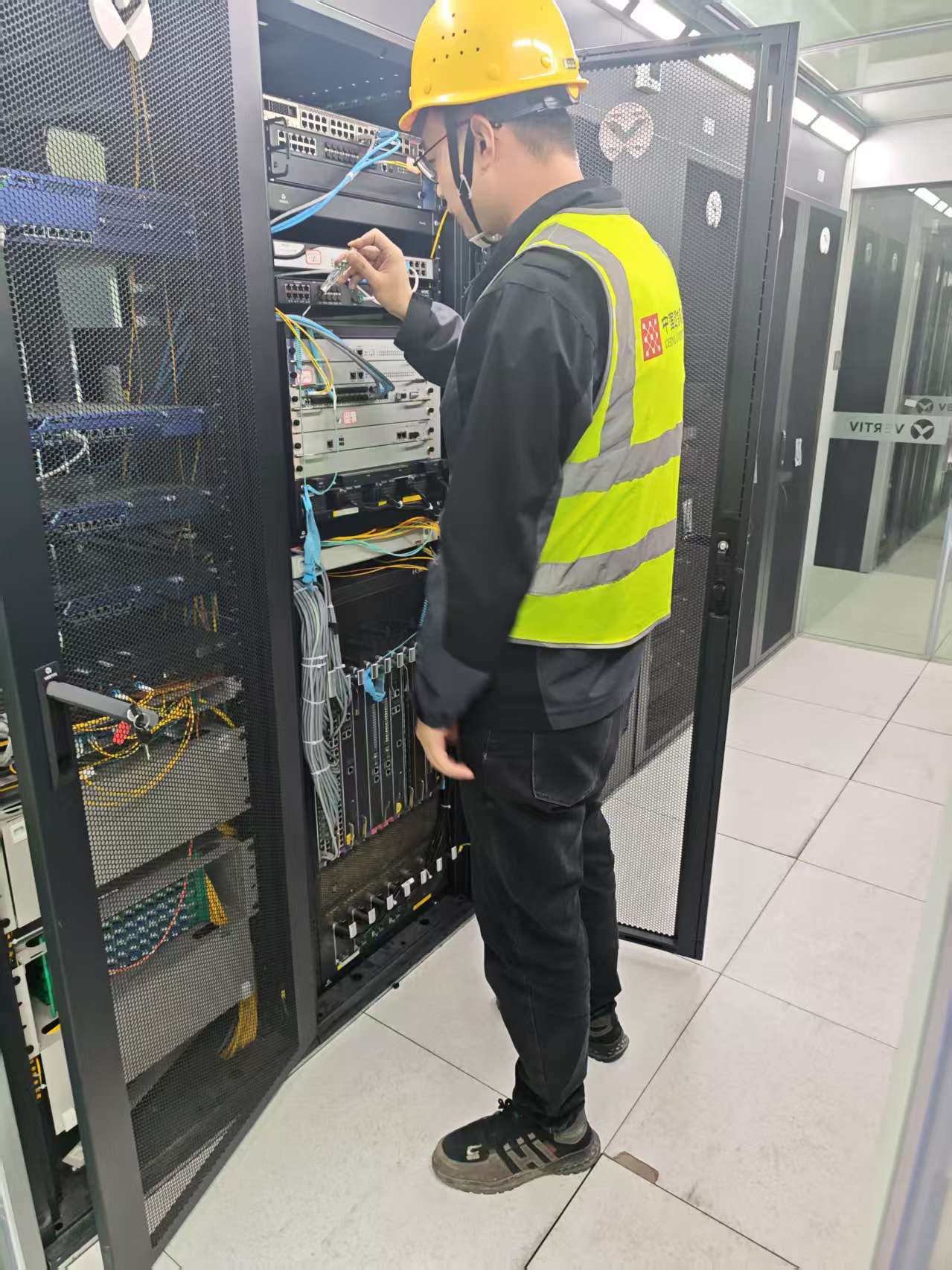 达州电信2025年高考通信保障工作组人员正在机房排查故障。