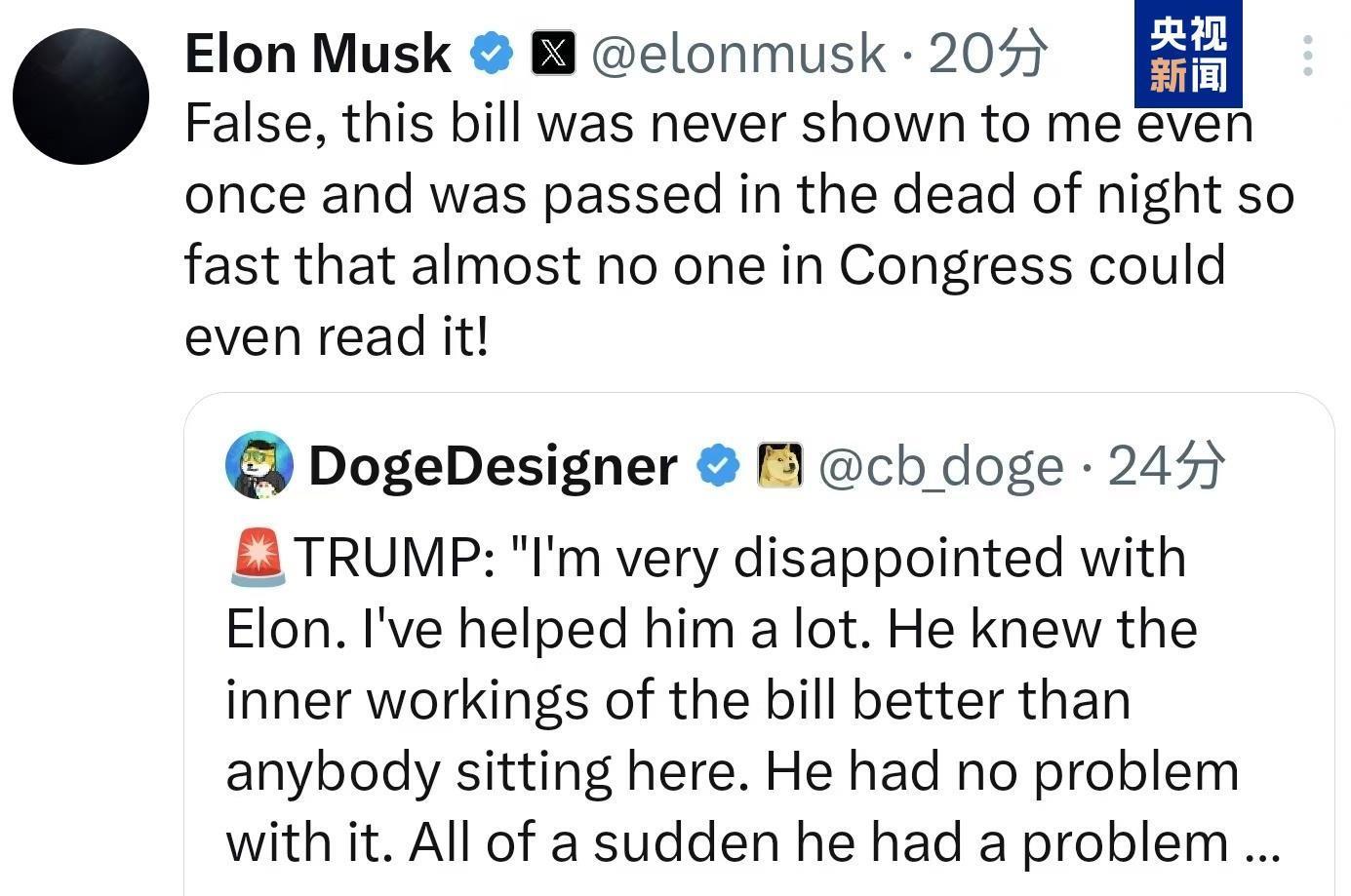 特朗普说马斯克对“大而美”法案早就心知肚明。马斯克反驳说:法案趁夜火速通过,“一次也没有给我看过”。
