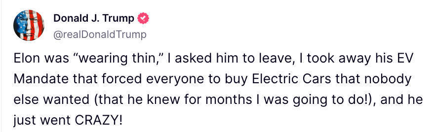 马斯克发起投票,说要建立新政党,团结80%的中间选民。特朗普回击说:“我要求他离开政府,取消了他的电动车强制令,所以他疯了!”