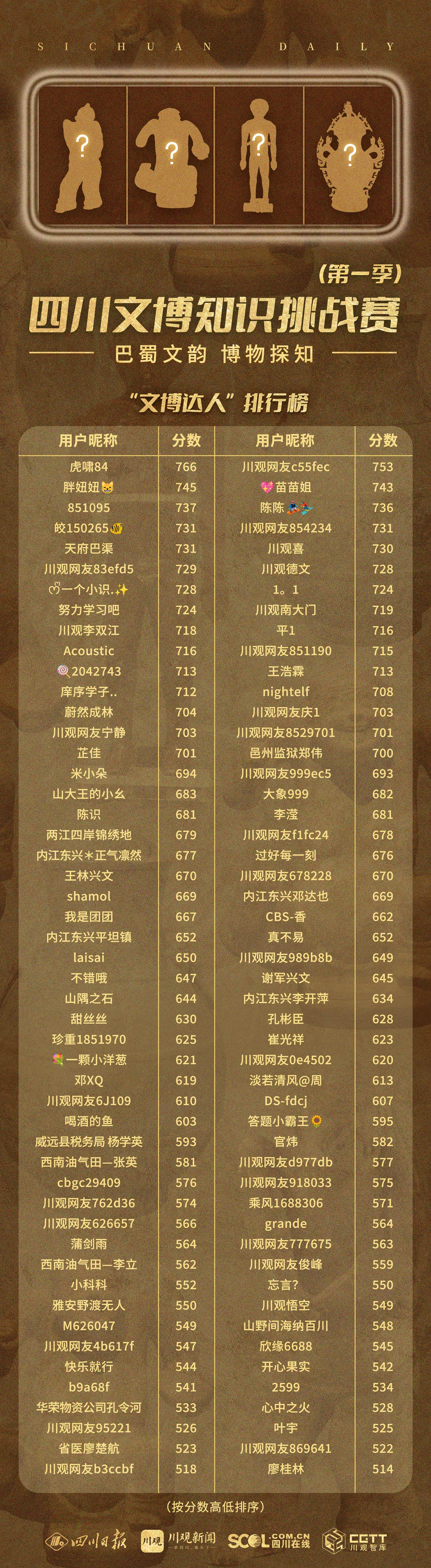五月三场文博挑战赛,唱响了博物馆日活动,让我们穿梭千年,尽览华夏文明史和古蜀文化精髓,进一步加强对省博物院和成都博物馆藏品陈列的认识,下次再逛展必有不一样的体验。期待文博挑战第二季,让我们再聚川观,畅游历史长河!