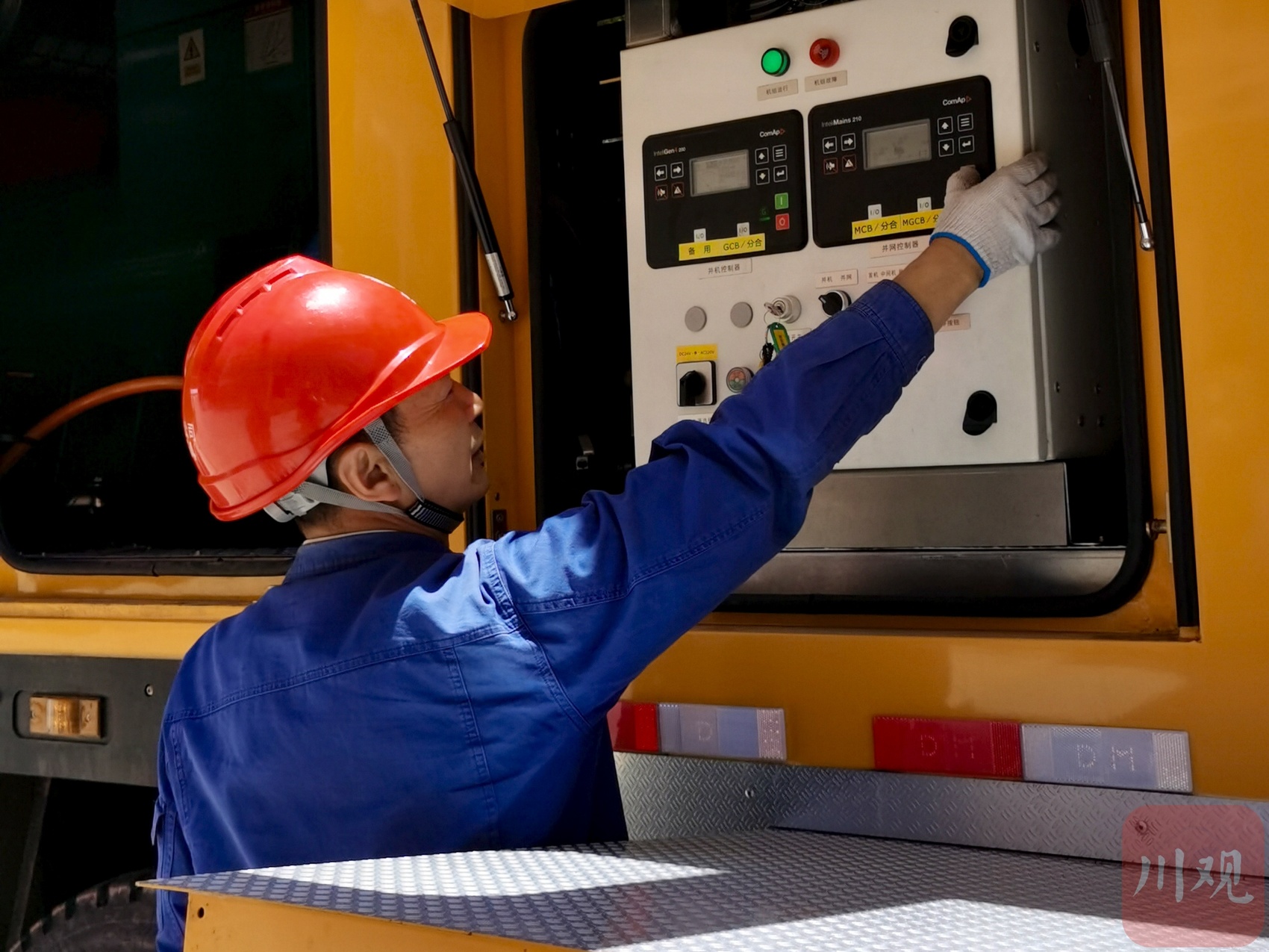 国网理县供电公司高考保电人员王大胜,正在对理县中学考点应急发电车进行调试。