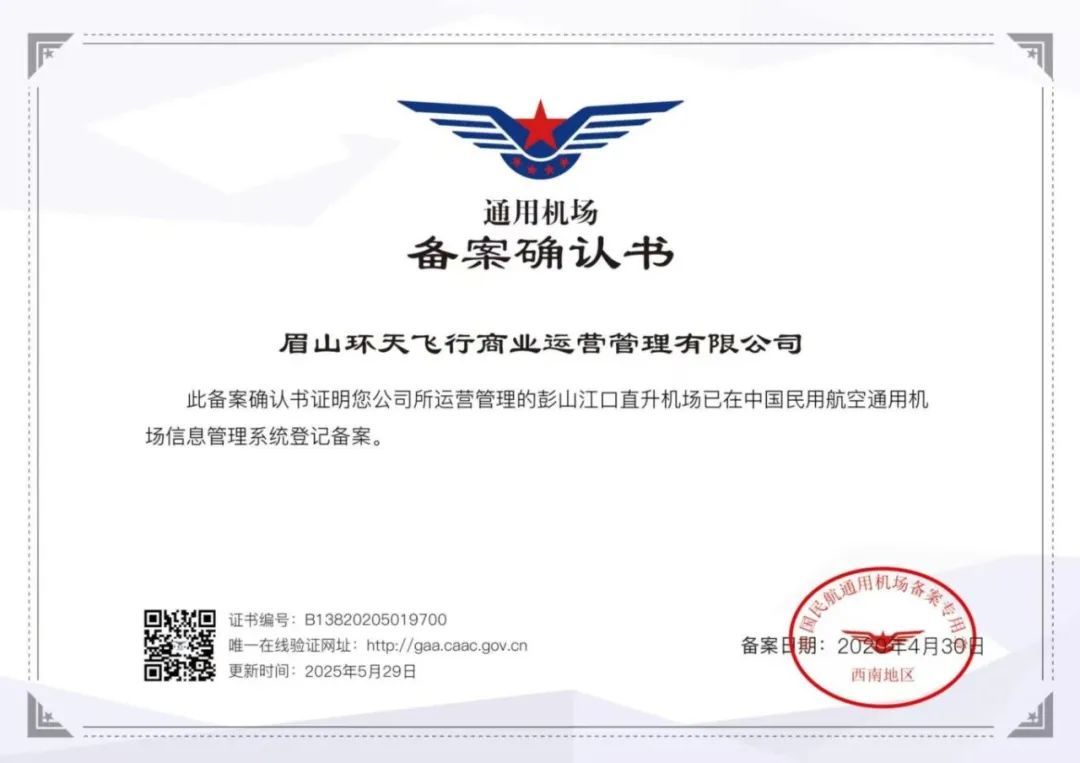 近日,彭山江口通用机场正式获得民航监管部门认证的规范化运营资质。