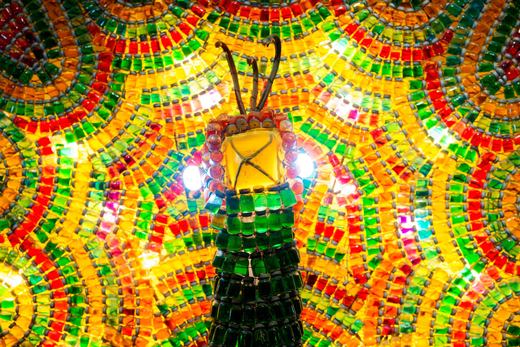 这是2025年6月5日在四川省自贡市中国彩灯博物馆拍摄的用玻璃药瓶制作的彩灯“孔雀开屏”。