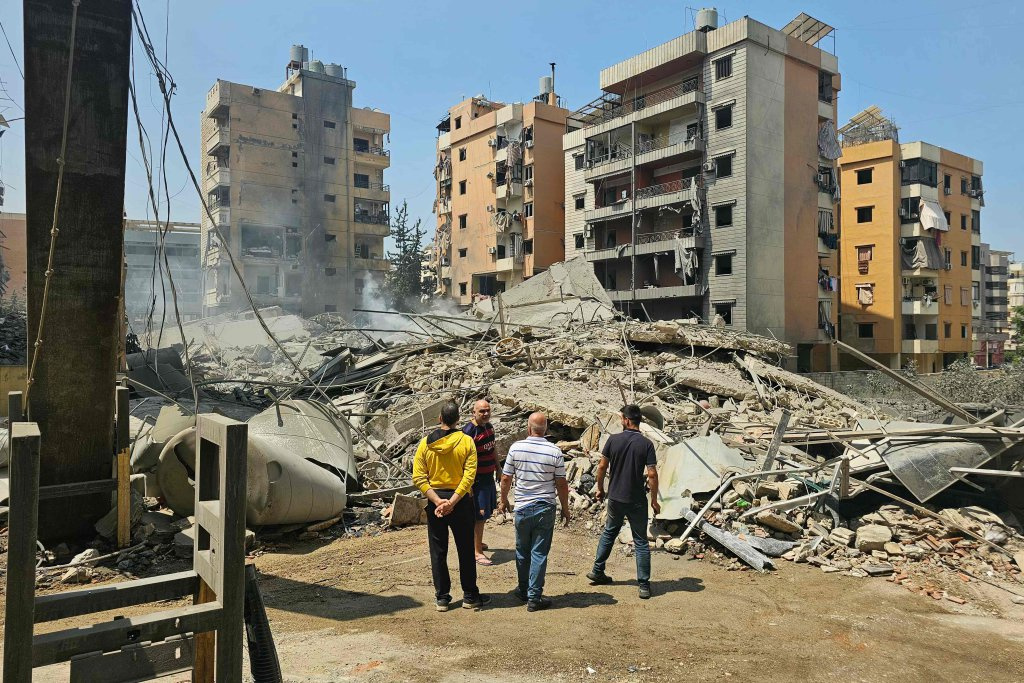6月6日,在黎巴嫩贝鲁特南郊,人们站在以色列空袭后的建筑废墟旁。