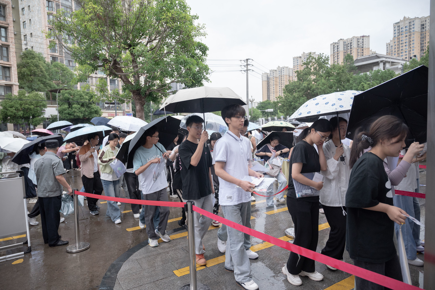 “我去年刚参加完高考,深知考生和家长的不易,所以今年特意报名参加志愿服务,就想为他们尽一份力。”志愿者杨佳慧边说边为候考家长递上饮用水。
