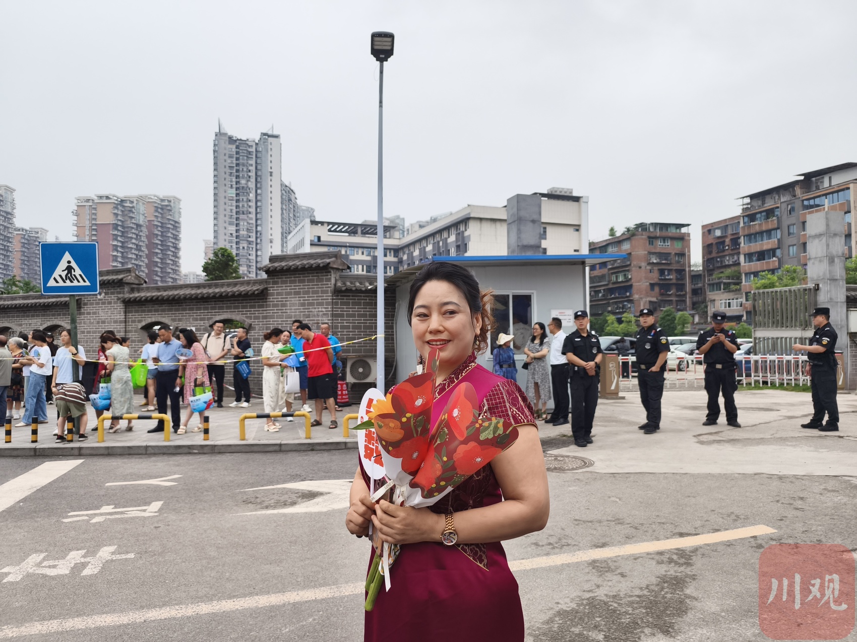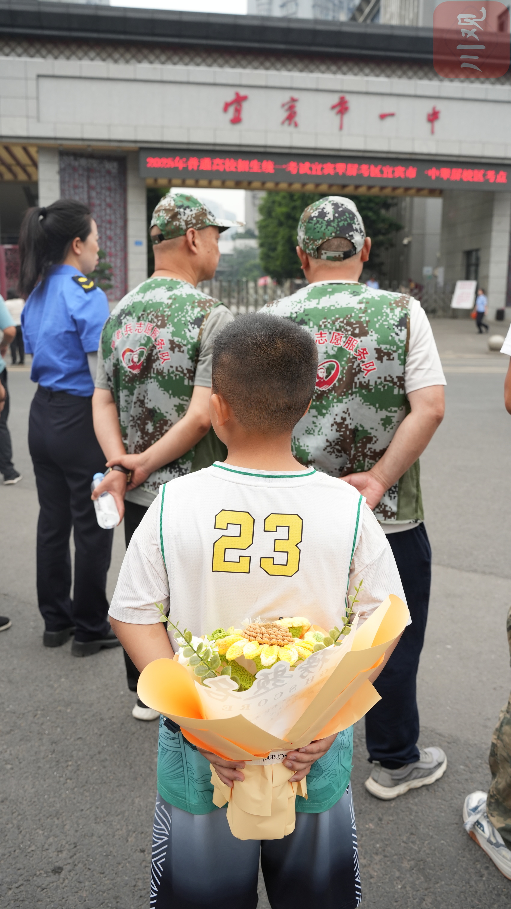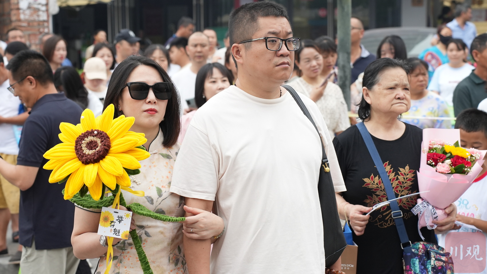 不少家长身穿寓意“旗开得胜”的旗袍,手捧象征“一举夺魁”的向日葵,以特别的方式为考生们加油鼓劲。