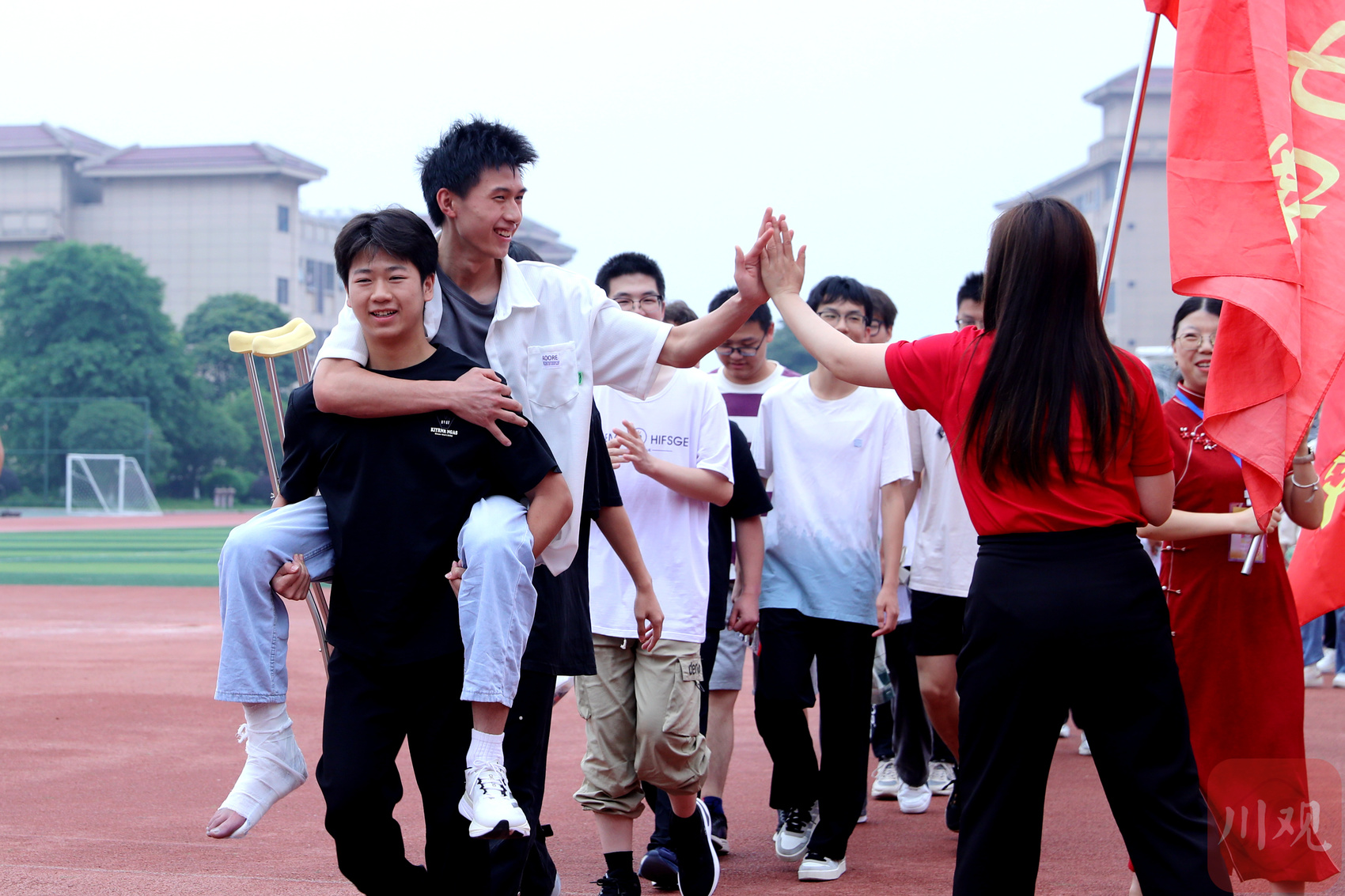 6月7日,泸州市纳溪中学考点,一名考生背着脚受伤的同学进入考场,老师与同学们击掌鼓励。C视觉签约摄影师 廖胜春 摄