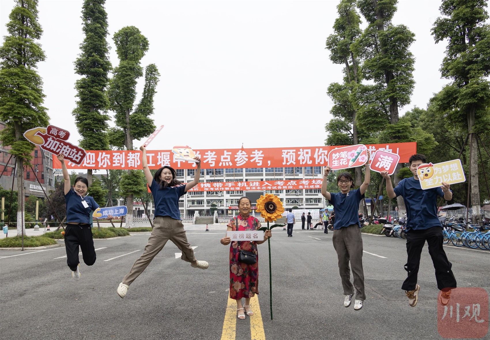 6月7日,都江堰中学考点外,等待的家属手持葵花,与志愿者一同为考生加油祝福。C视觉签约摄影师 何勃 摄