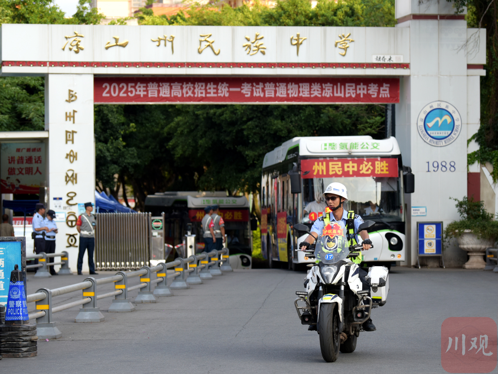 6月7日,凉山州民族中学的高考大巴由警车开道,护航考生出征高考。C视觉签约摄影师 吉木木且 摄