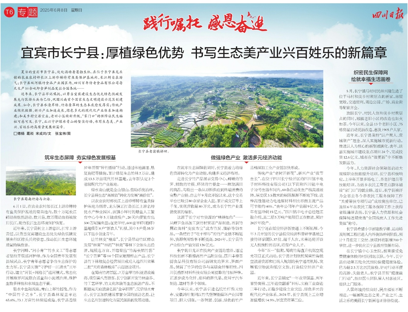 近年来,长宁县牢记嘱托,以勇当宜宾建设生态优先绿色低碳发展先行区排头兵为己任,巩固川南首个国家生态文明建设示范区创建成果。如今,长宁县水清岸绿、竹海叠翠的生态本底愈发厚实;传统产业做优做强、新兴产业加速成长,绿色多元的现代化产业体系加速构建;和美乡村宜居宜业,老旧小区焕新升级,“家门口”的保障让民生福祉可感可及。长宁,正以守护绿水青山的坚实行动,书写生态美、产业兴、百姓乐的高质量发展新篇章。