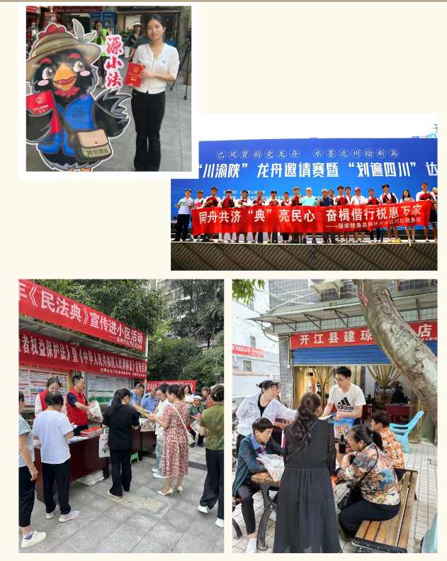 达州市各地各部门结合“法治达州·一月一主题”活动,不断创新宣传形式,开展“送民法典进社区”活动,让《民法典》更“亲民”。达州市达川区司法局将《民法典》宣传与“宜美融治 共享方舟”法治惠民活动深度融合,将《民法典》精神直接转化为现场法律咨询、法律援助、纠纷调解等群众可见可享等法治实践。达川区税务局巧借“川渝陕”龙舟邀请赛暨“划遍四川”达川站活动契机,在龙舟赛赛场搭建“‘典税’普法龙舟流动服务站”,为群众普及《民法典》和税法知识。达州市开江县检察院、开江县税务局联合在城市综合体开展“税检联袂弘法义 典章普照惠万家”商圈普法快闪活动,通过电子屏展播、发放普法宣传手册等方式,吸引大量群众参与《民法典》宣传。达州市达川区司法局、开江县司法局结合“法治小区”建设,开展“送民法典进小区”宣传活动;达州万源市司法局推出本土法治IP“源小法”(小名硒硒),化身普法形象大使,走入古东关街道、草坝镇等地,宣传《民法典》。