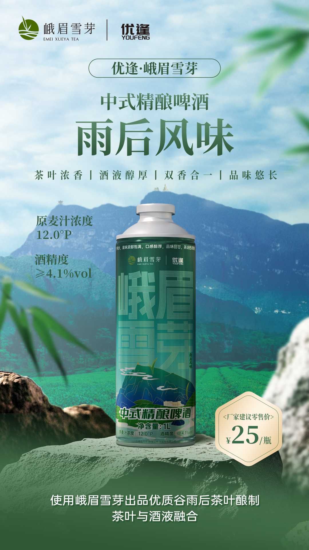 记者咨询峨眉雪芽茶业集团订购热线了解到,此次主要推出两款新品——中式精酿啤酒“雨后风味”和“雨前风味”。这两款茶啤的原麦汁浓度和酒精度略有不同,目前两款规格均为1L/瓶,建议零售价为25元/瓶,预计下半年还将推出一款以茉莉花茶为主原料的茶啤。上述产品市场主要聚焦川渝市场,依托现有的峨眉雪芽茶业集团经销商渠道进行销售。