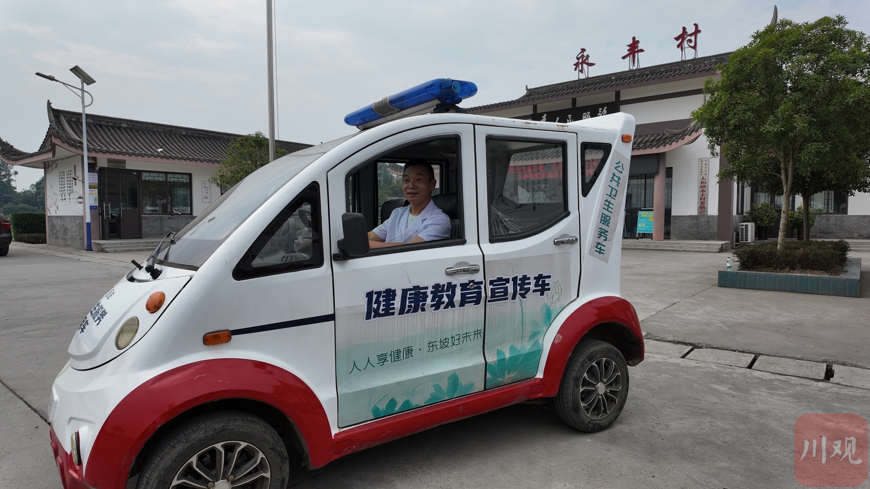 眉山市东坡区太和镇永丰村村医周良伦定期开着公共卫生服务小车,给村民量血压、测血糖等。魏冯 摄