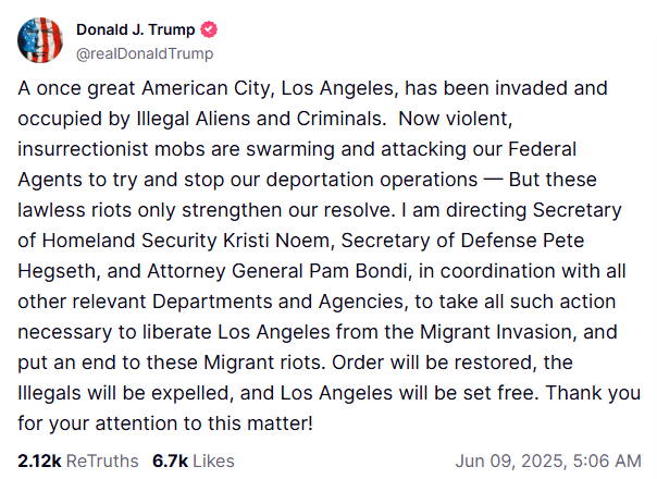 特朗普的言辞更加强硬,称洛杉矶已被非法移民和罪犯“入侵占领”,要求国土安全部长、国防部长等“解放洛杉矶”。
