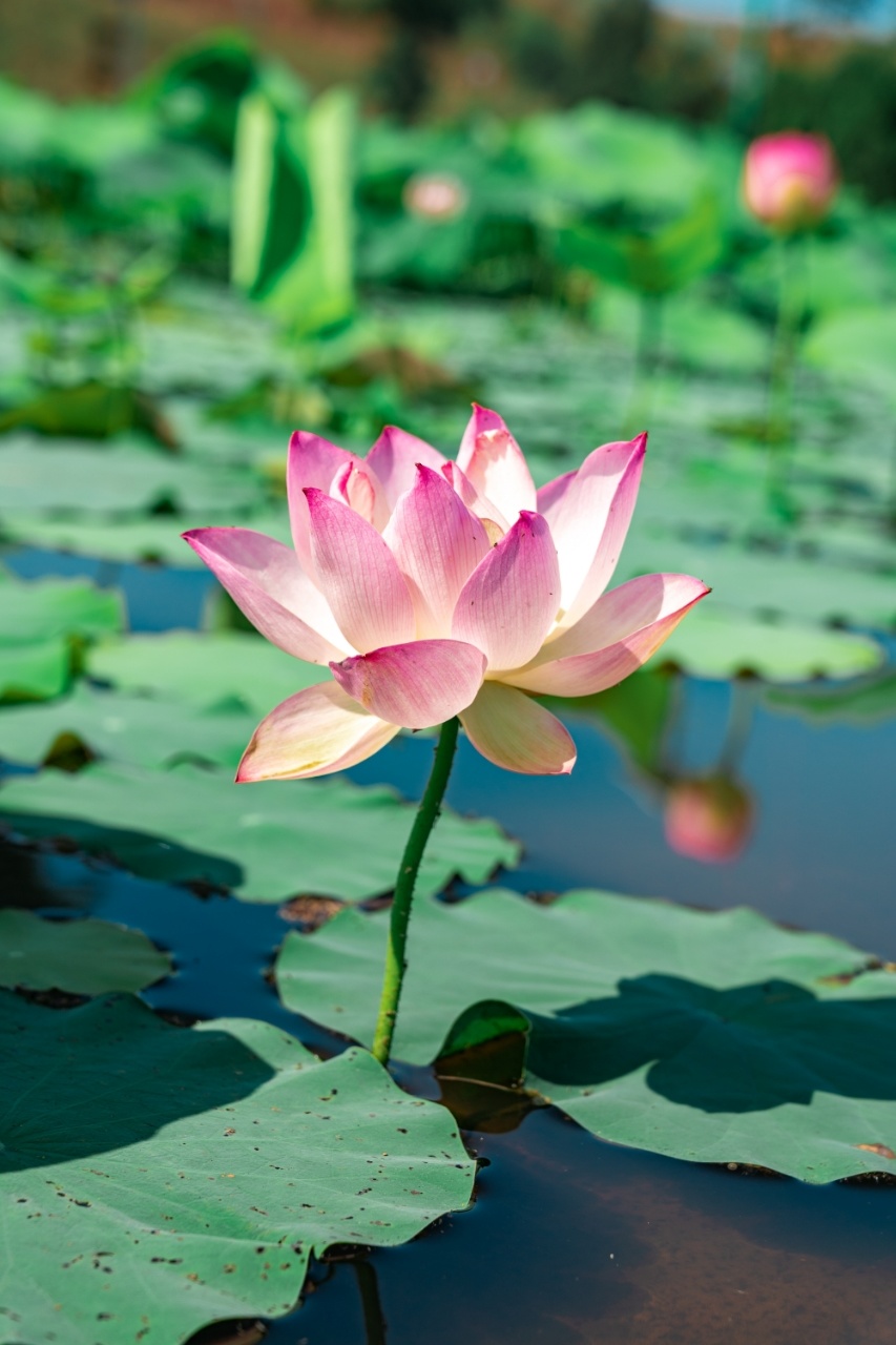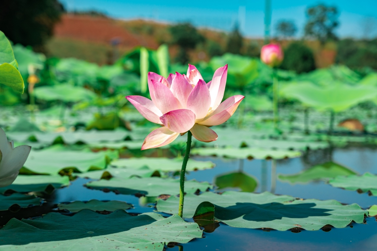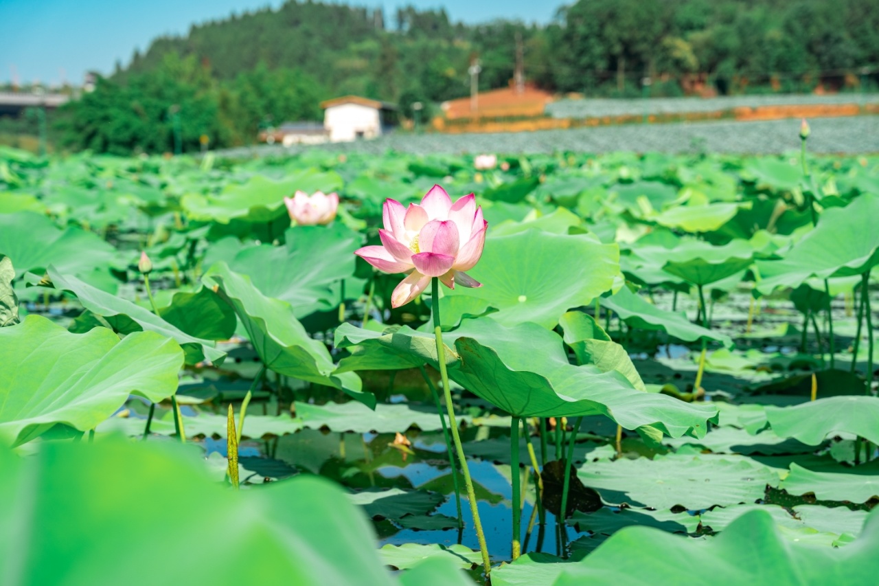 6月10日,资阳临空经济区红碑村的百亩荷塘迎来今夏首批荷花初绽。粉白相间的荷花竞相绽放,与碧叶相映成趣。